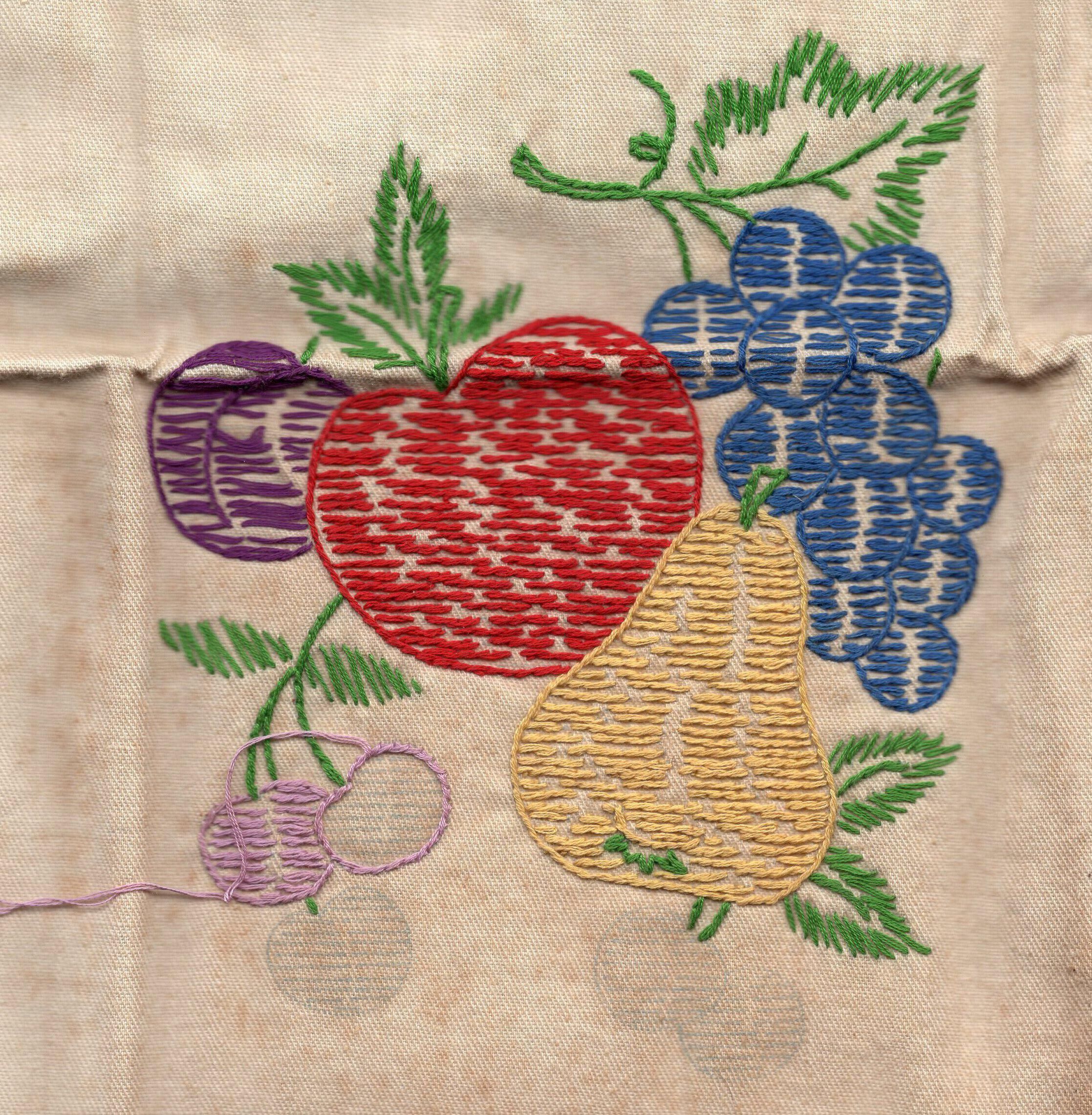 This panel was a mid 20th century pre-printed pattern with water soluble printed ink. The stitcher on this piece never finished.Created By