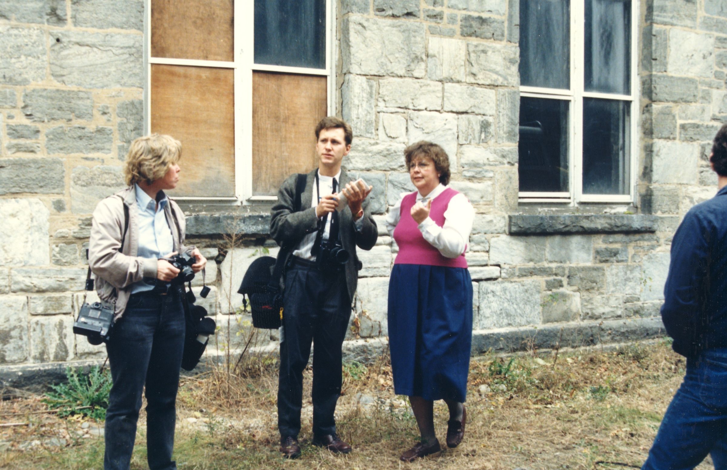 Color photographic print of four people standing in front of Mill No. 2, American Thread Company, Willimantic, CT. The woman on the right is Laura Knott Twine, the founding Executive Director of the Mill Museum. The two people standing to her left are carrying photographic equipment, and are unknown. Windows are boarded up. The photographer who took this photograph is unknown. It was taken c. 1987, shortly after ATCO closed its Willimantic plant.Photograph Details