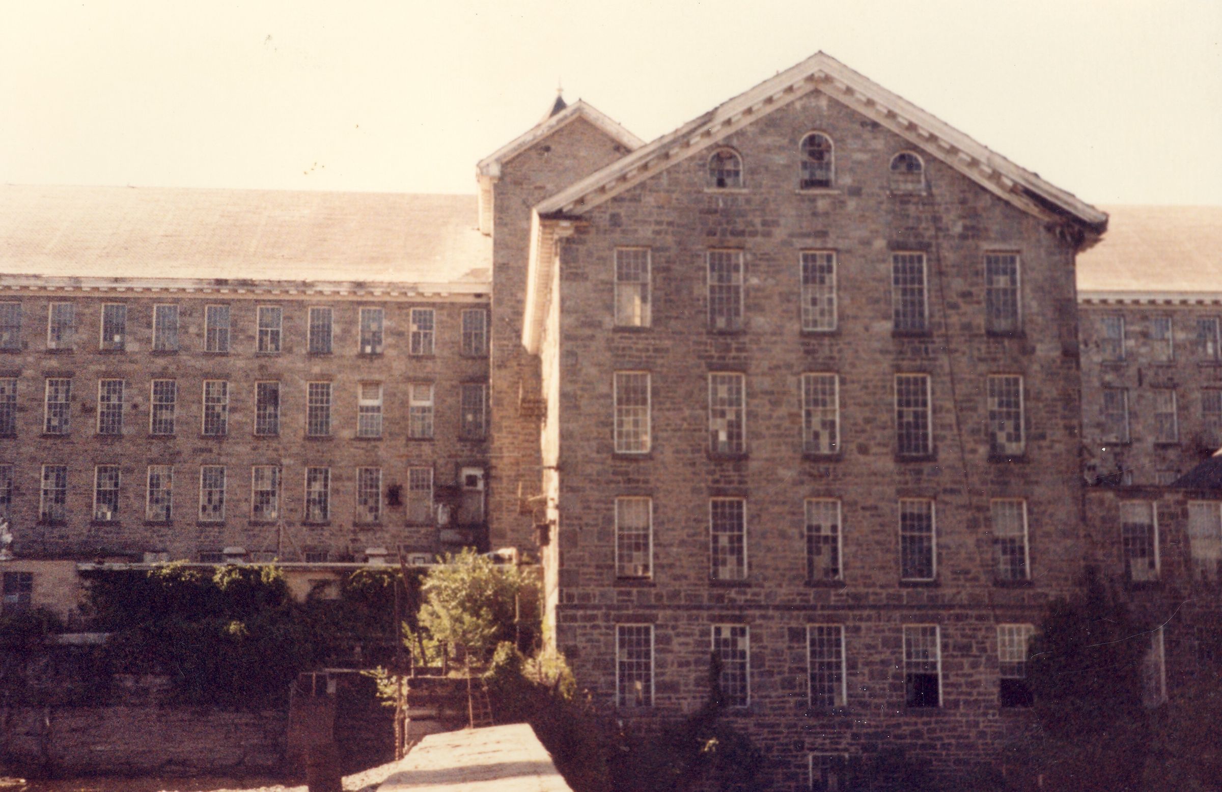 Color photographic print of south (river) side of Mill No. 2, American Thread Company, Willimantic, CT, showing the wheelhouse and stone mill dam. Unknown photographer. Taken c. 1987, shortly after ATCO closed its Willimantic plant.Photograph Details