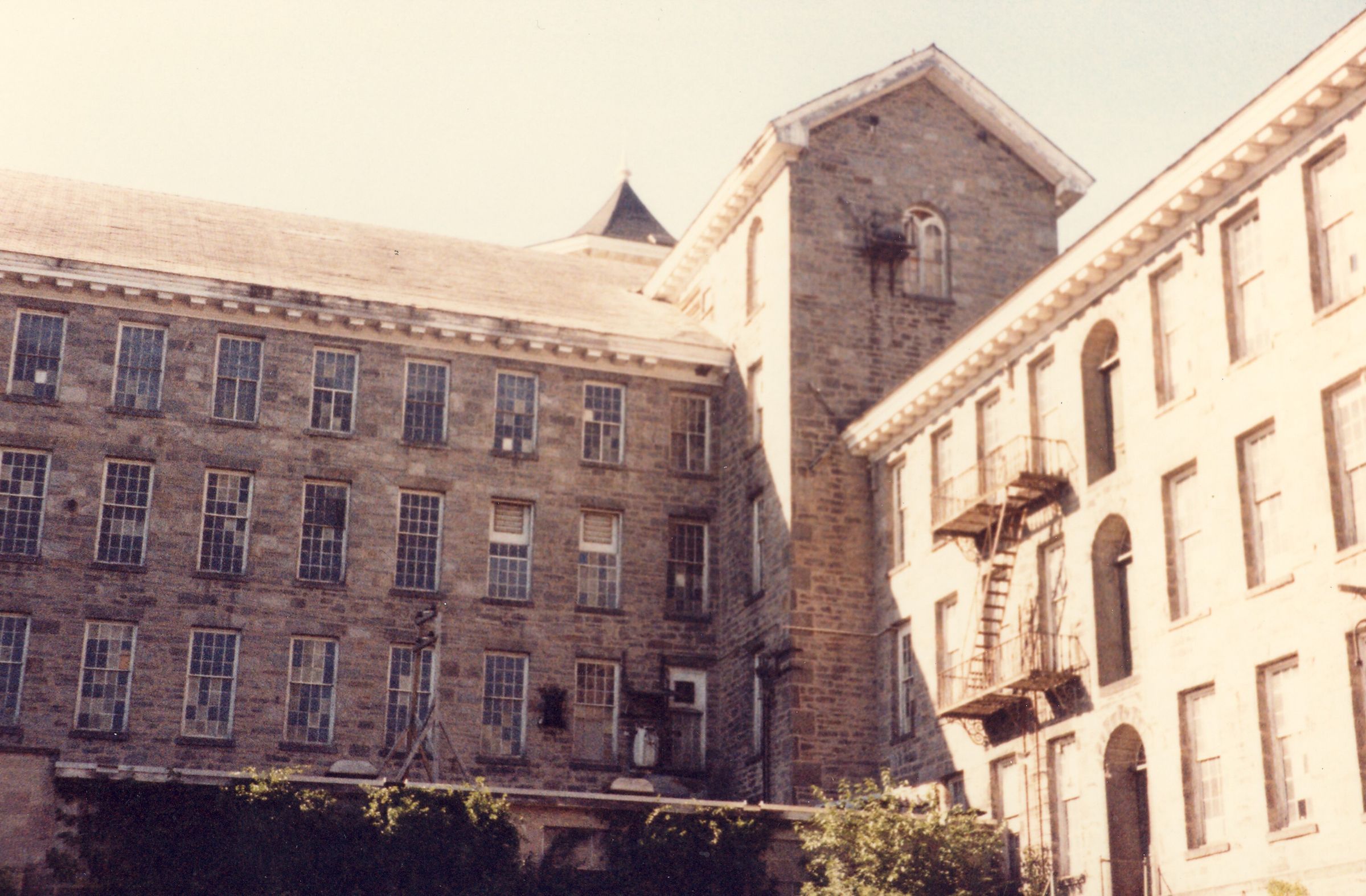 Color photograph of the river side of Mill No. 2, American Thread Company, Willimantic, CT. Unknown photographer. Taken c. 1987, shortly after ATCO closed its Willimantic plant.Photograph Details