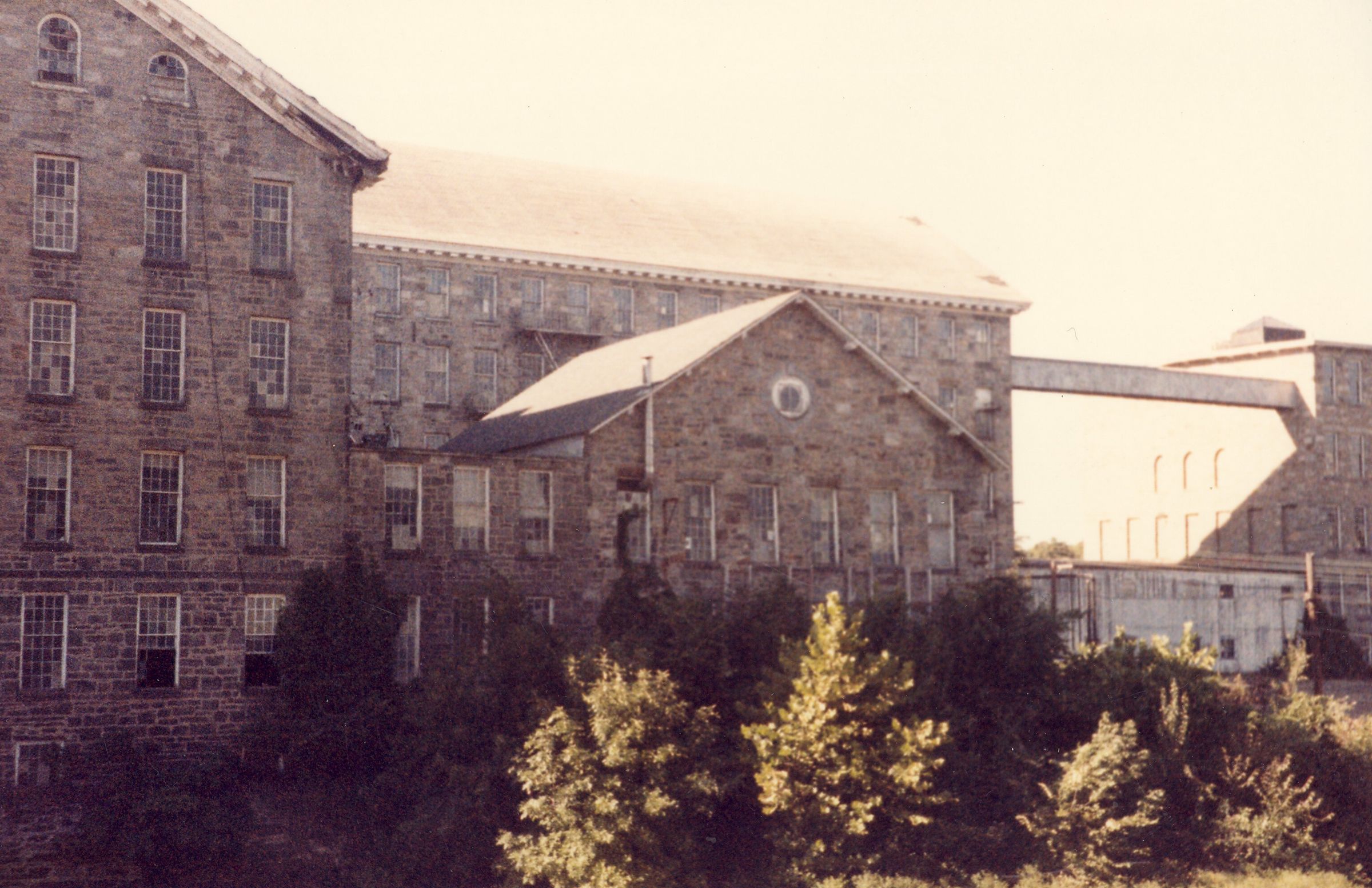 Color photographic print of the river side of Mill No. 2, American Thread Company, Willimantic, CT. Shows the wheelhouse. Unknown photographer, Taken c. 1987, shortly after ATCO closed its Willimantic plant.Photograph Details