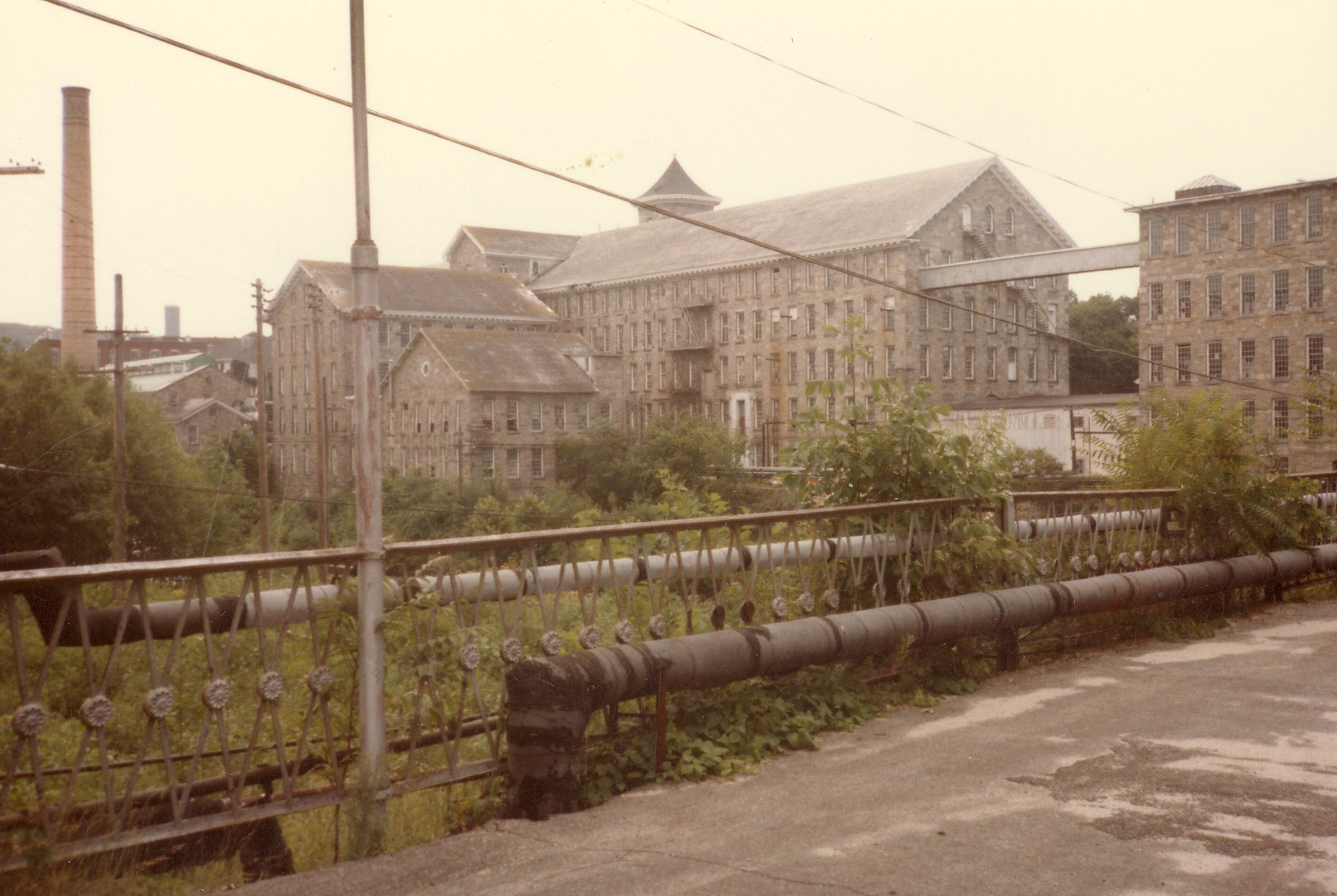 Color photographic print of Mill No. 2, American Thread Company, Willimantic, CT. Taken from Pine Street Bridge. Unknown photographer. Taken c. 1987, shortly after ATCO closed its Willimantic plant.Photograph Details