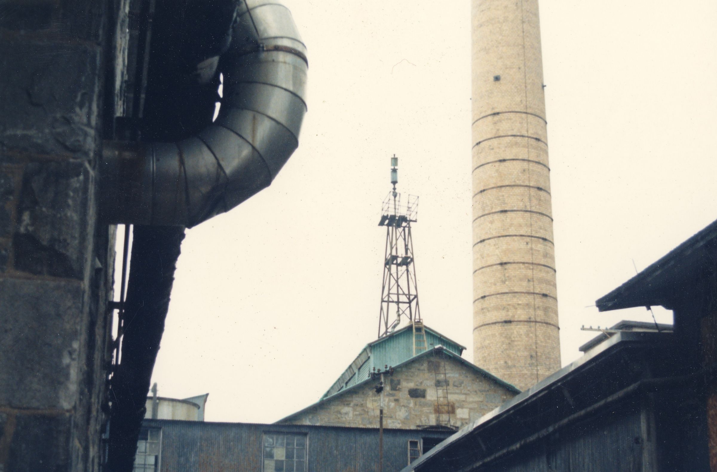 Color photograph of the smokestack and boiler house roof of Mill No. 2, American Thread Company, Willimantic, CT. Shows steam whistle. Photographer unknown. Taken c. 1987, shortly after ATCO closed its Willimantic plant.Photograph Details