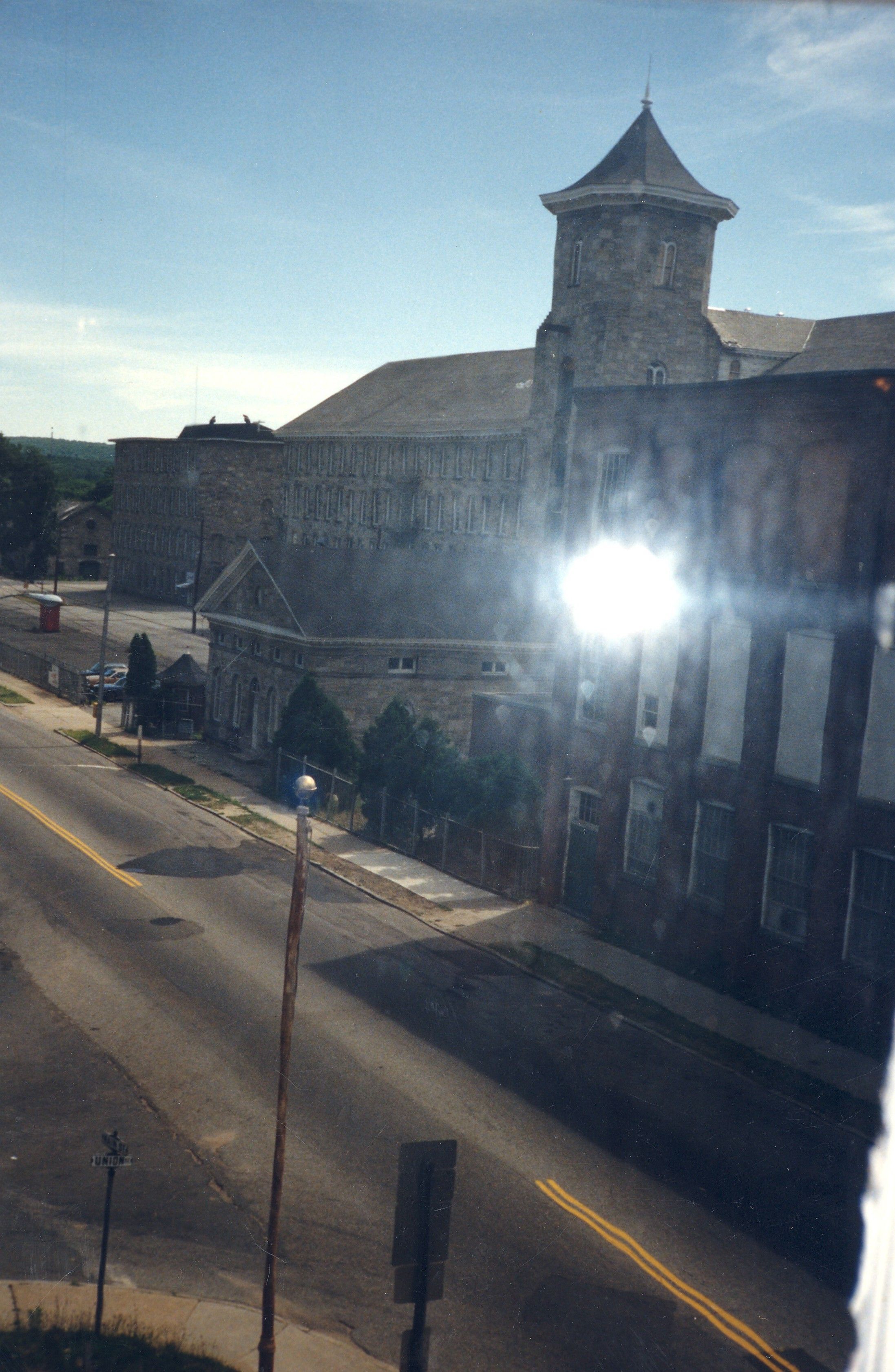 Color photographic print of Mill No. 2, stone office building, and brick dye house, American Thread Company, Willimantic, CT. Taken from upper story window of what is now the Windham Textile and History Museum's main building. Photographer unknown. Taken c. 1987, shortly after ATCO closed its Willimantic plant.Photograph Details
