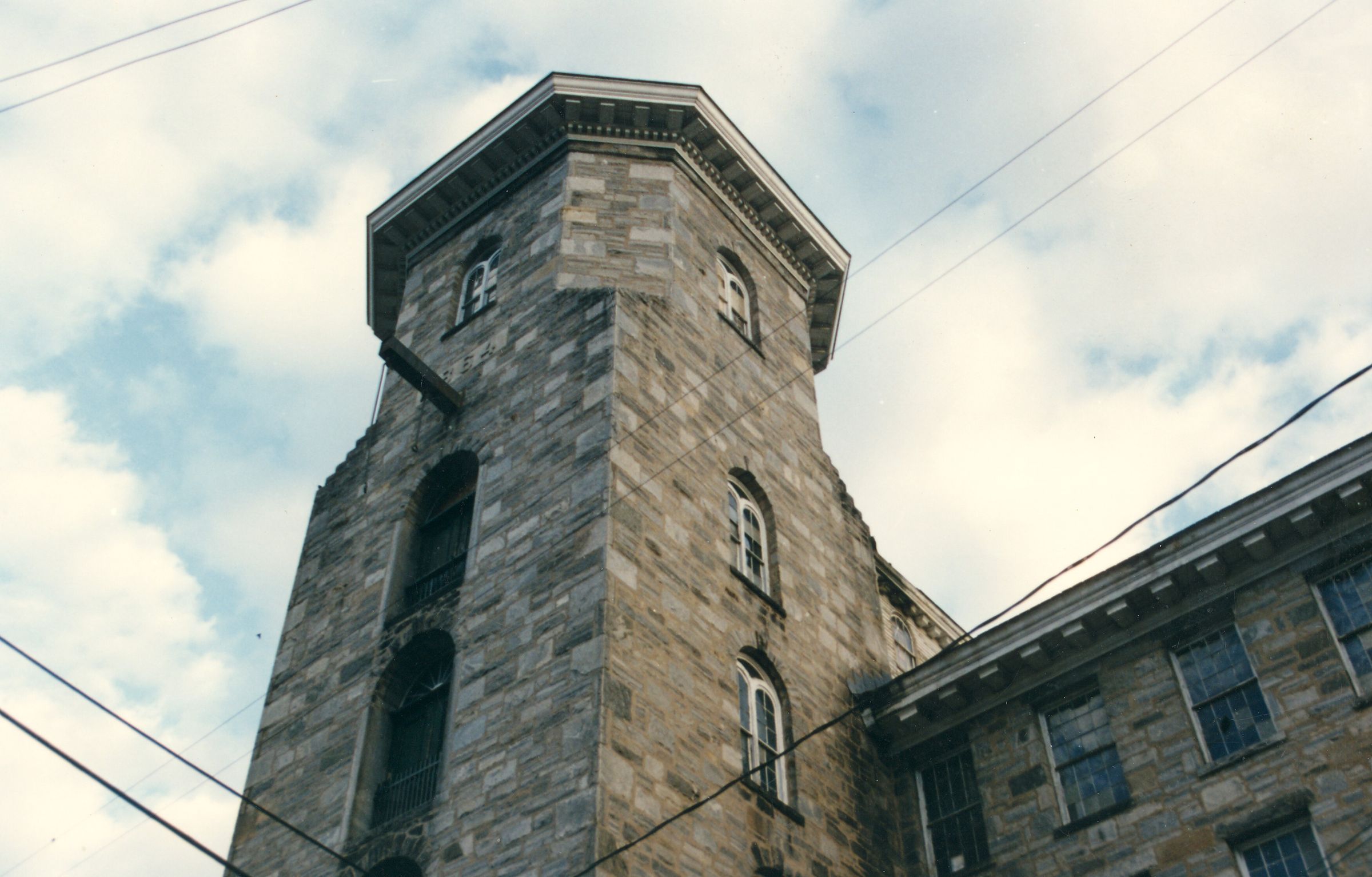 Color photographic print of the tower to Mill No. 2, American Thread Company, Willimantic, CT. Unknown photographer, Taken c. 1987, shortly after ATCO closed its Willimantic plant.Photograph Details