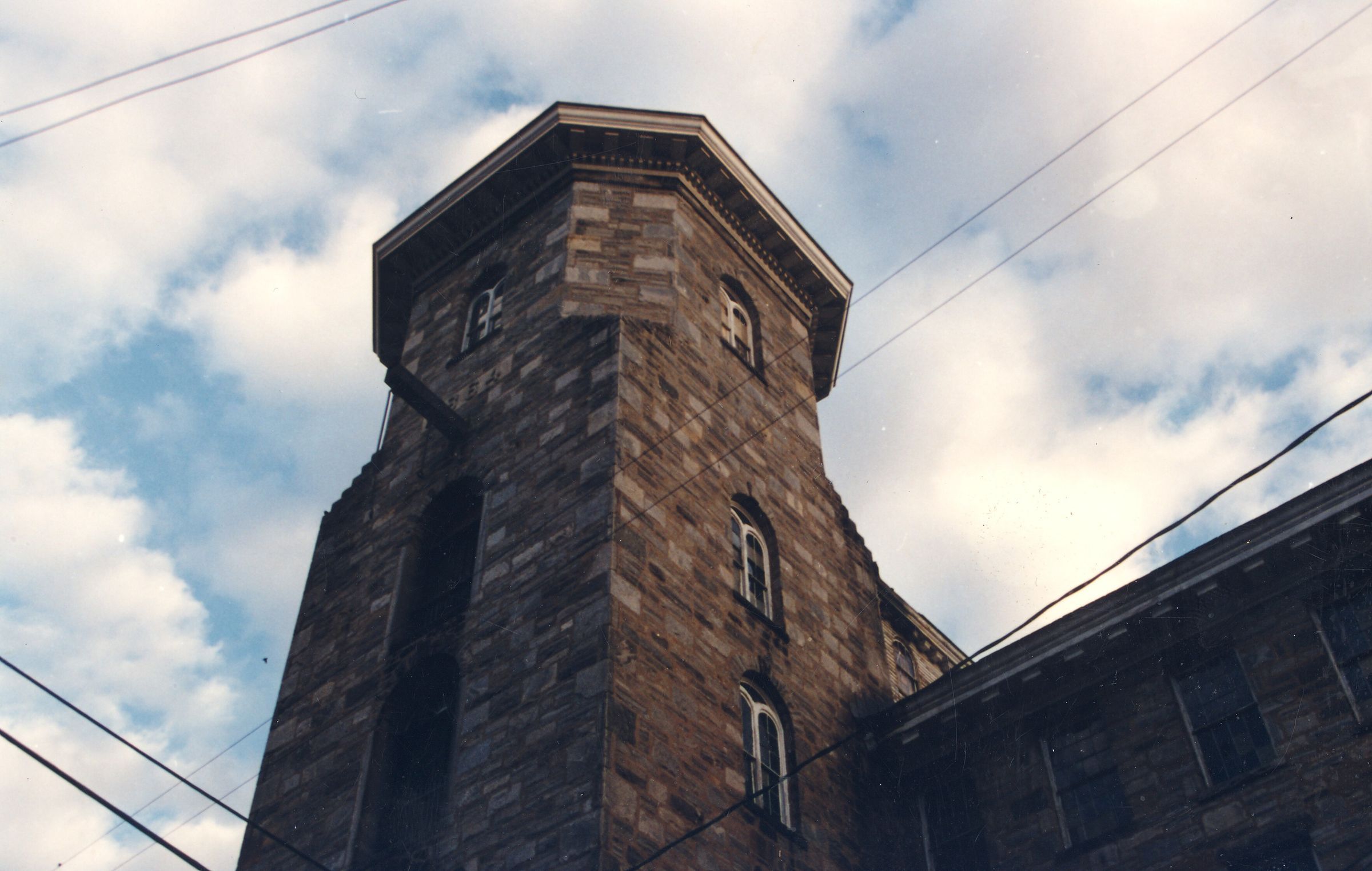 Color photographic print of tower to Mill No. 2, American Thread Company, Willimantic, CT. Unknown photographer. Taken c. 1987, shortly after ATCO closed its Willimantic plant.Photograph Details