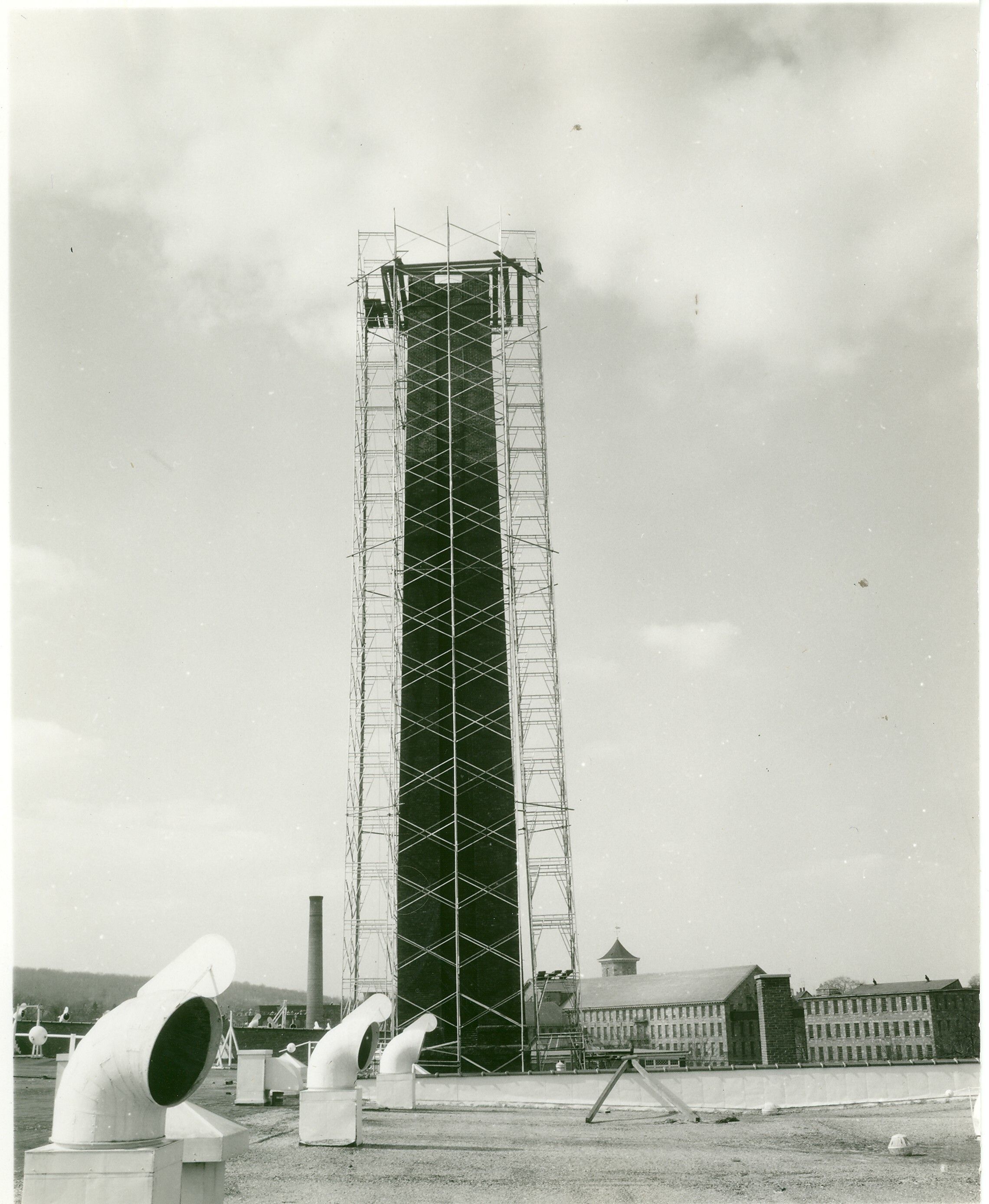 Black and white photographic print of repairs to the smokestack to Mill No. 4, American Thread Company. Unknown photographer. Taken c. 1955. 2 copies.Photograph Details