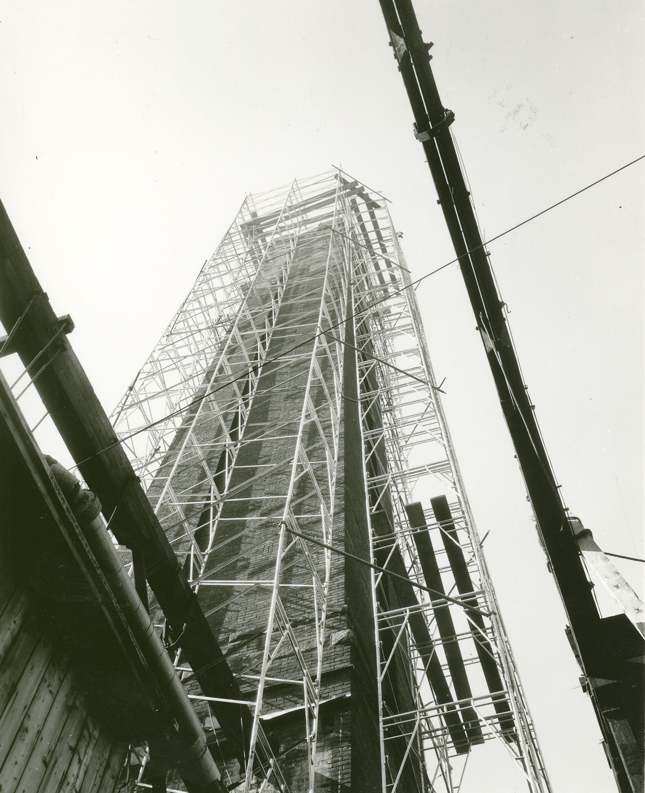Black and white photographic print of repairs being made to the smokestack to Mill No. 4, American Thread Company, Willimantic, CT. Unknown photographer. Taken c. 1955. 2 copies.Photograph Details