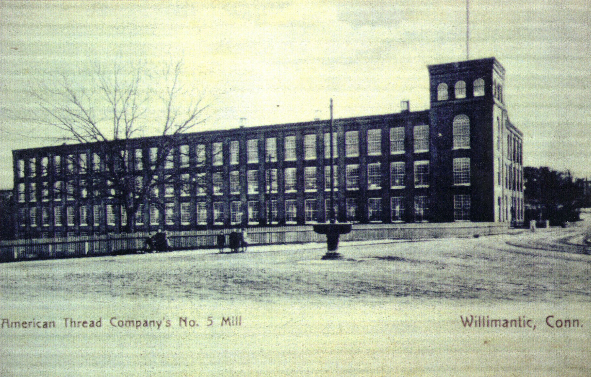Black and white copy of a photograph of the American Thread Company's Mill No. 5 and of Thread Mill Square in the foreground. Source of the original unknown. Mill No. 5 was built in 1899. Mill No. 6 -- which would be in front of Mill No. 5 -- was built in 1907 and is absent from this photo, so the photo was taken some time between 1899 and 1907.Photograph Details