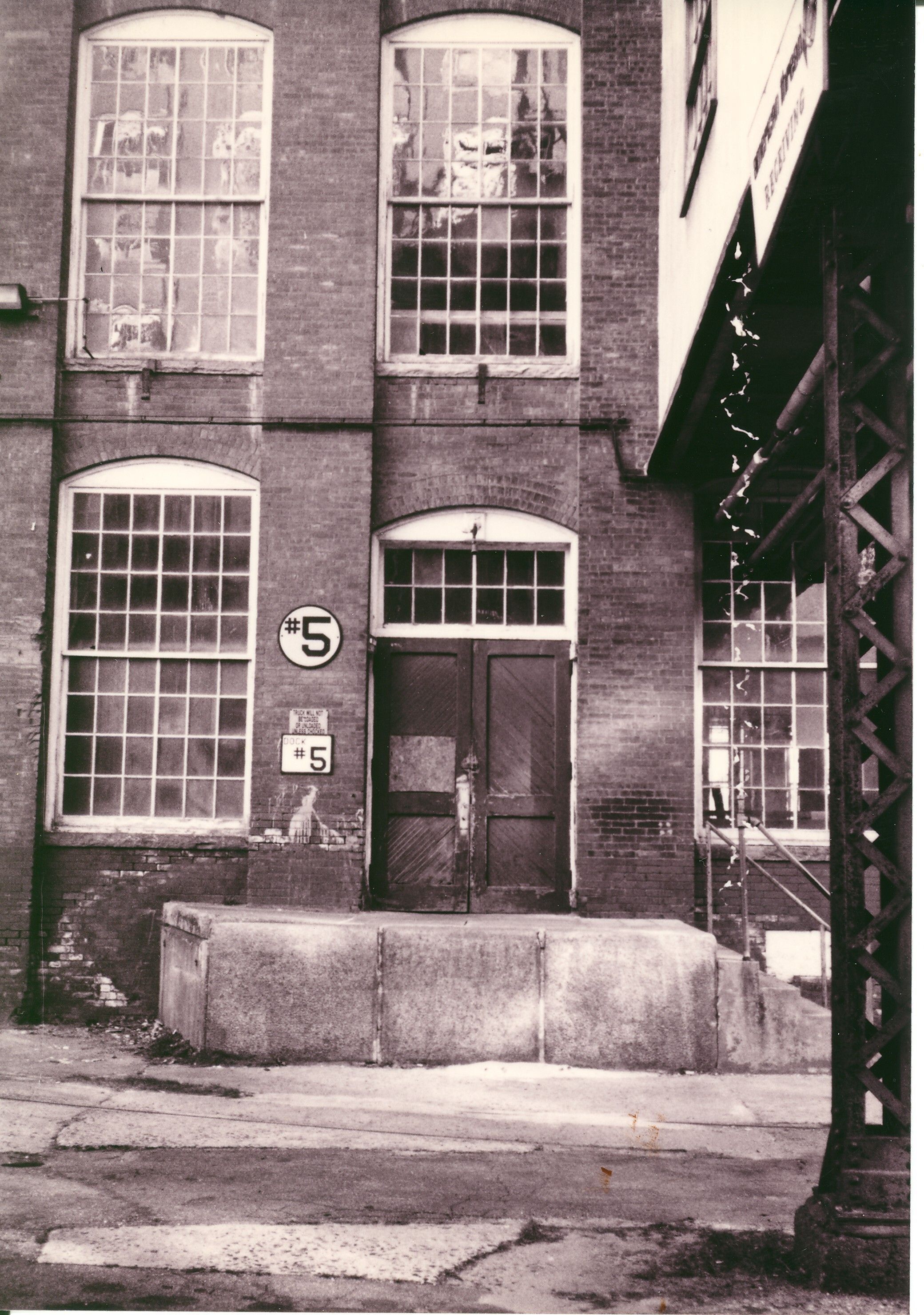 Black and white photographic print of Mill No. 5, American Thread Company, Willimantic, CT. Unknown photographer. Taken c. 1987, shortly after ATCO closed its Willimantic plant.Photograph Details