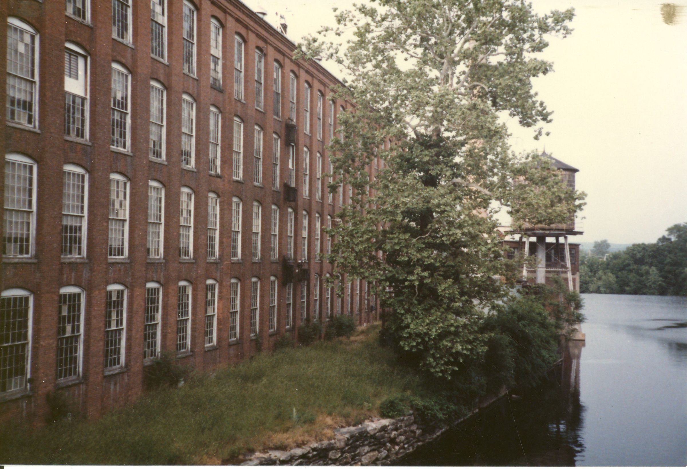 Color photographic print of the American Thread Company's Mill No. 5, viewed from the stone arch bridge over the Willimantic River. Unknown photographer. Taken c. 1987, shortly after ATCO closed its Willimantic, CT, plant.Photograph Details