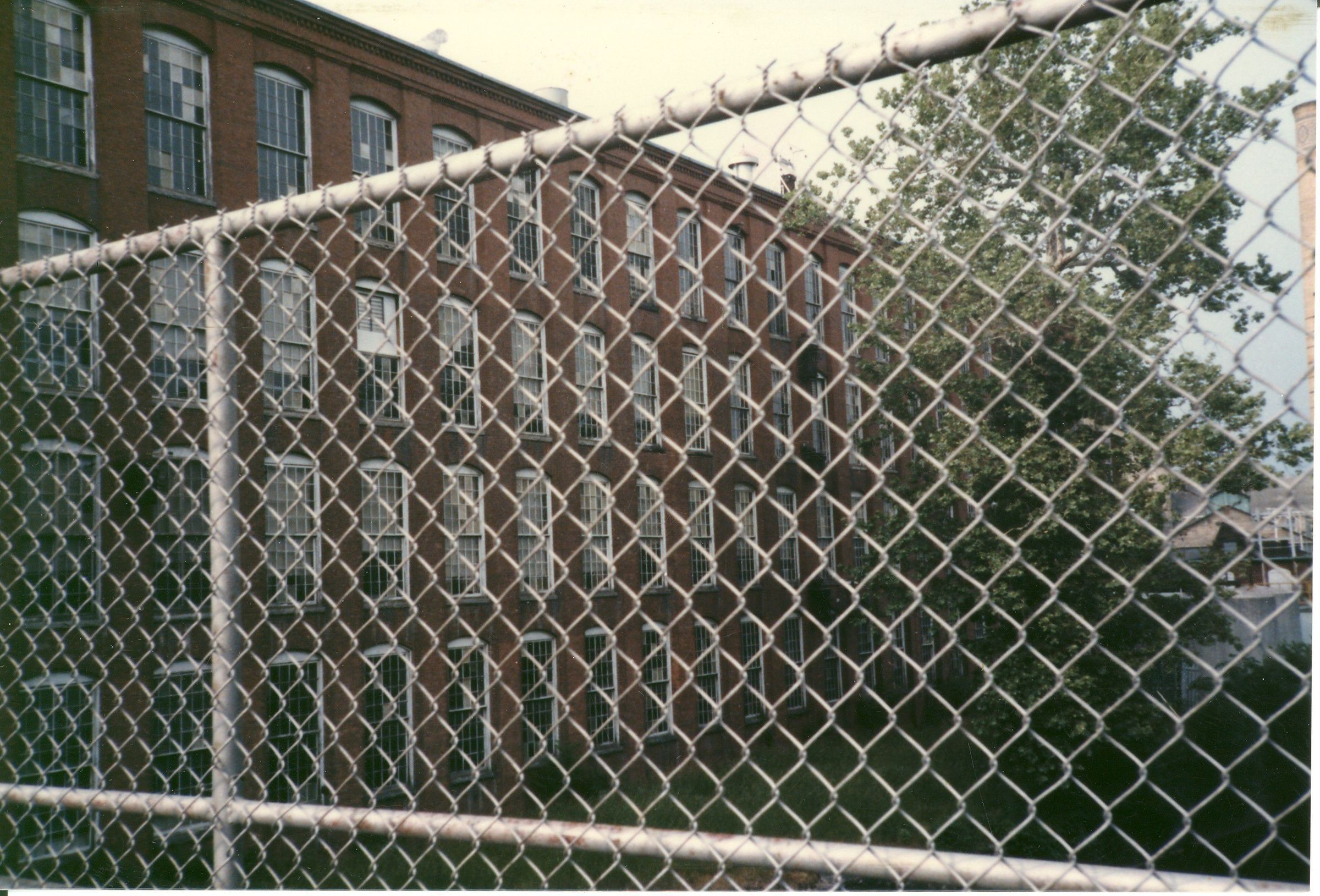 Color photographic print of Mill No. 5, American Thread Company, Willimantic, CT. Unknown photographer. Taken from the stone arch bridge (today's Garden on the Bridge), looking east. Taken c. 1987, shortly after ATCO closed its Willimantic plant.Photograph Details