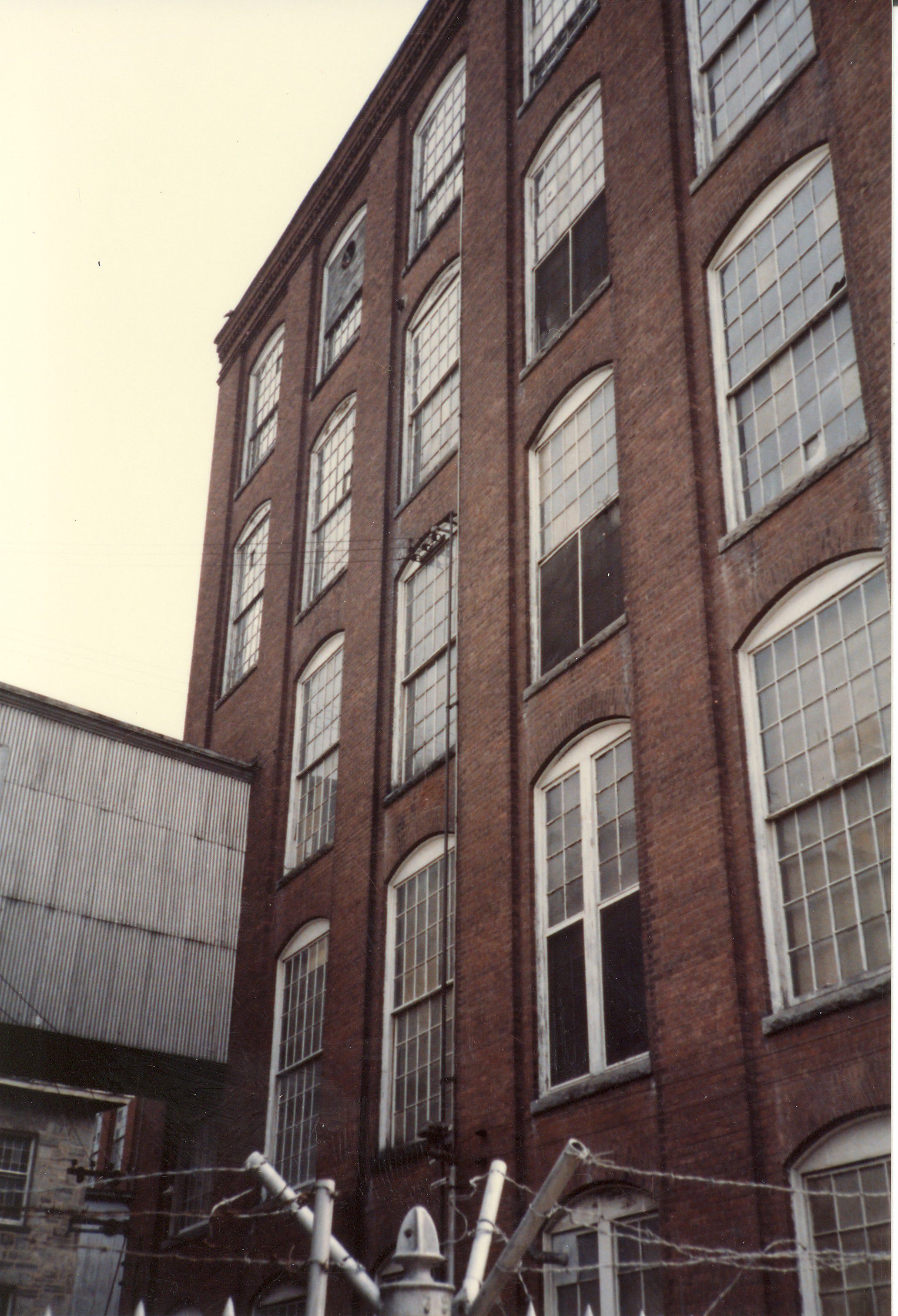 Color photographic print of Mill No. 5, American Thread Company, Willimantic, CT. Unknown photographer. Taken c. 1987, shortly after ATCO closed its Willimantic plant.Photograph Details