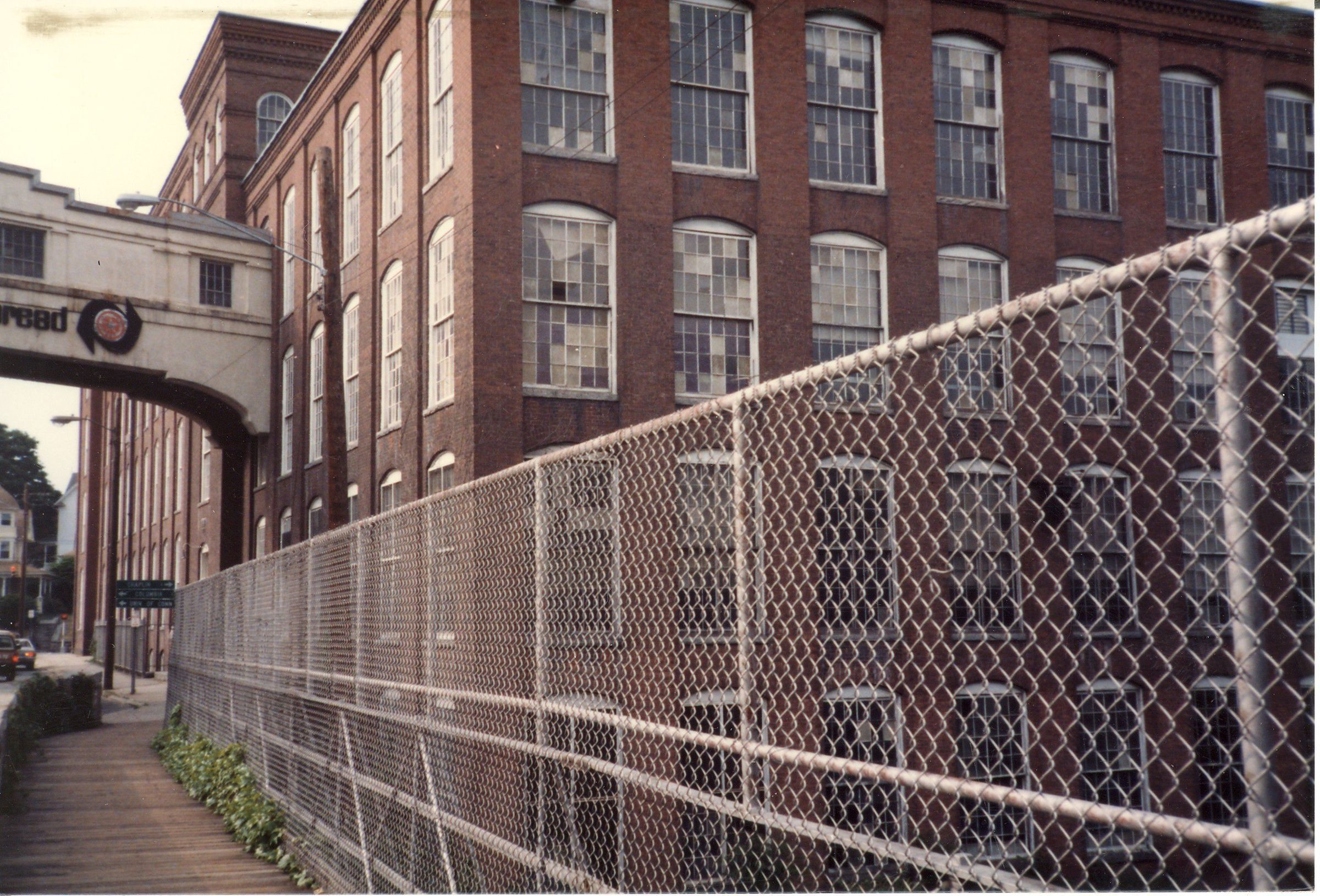Color photographic print of Mill No. 5, American Thread Company, Willimantic, CT. Taken from the stone arch bridge (now called the Garden on the Bridge). Unknown photographer. Taken c. 1987, shortly after ATCO closed its Willimantic plant.Photograph Details