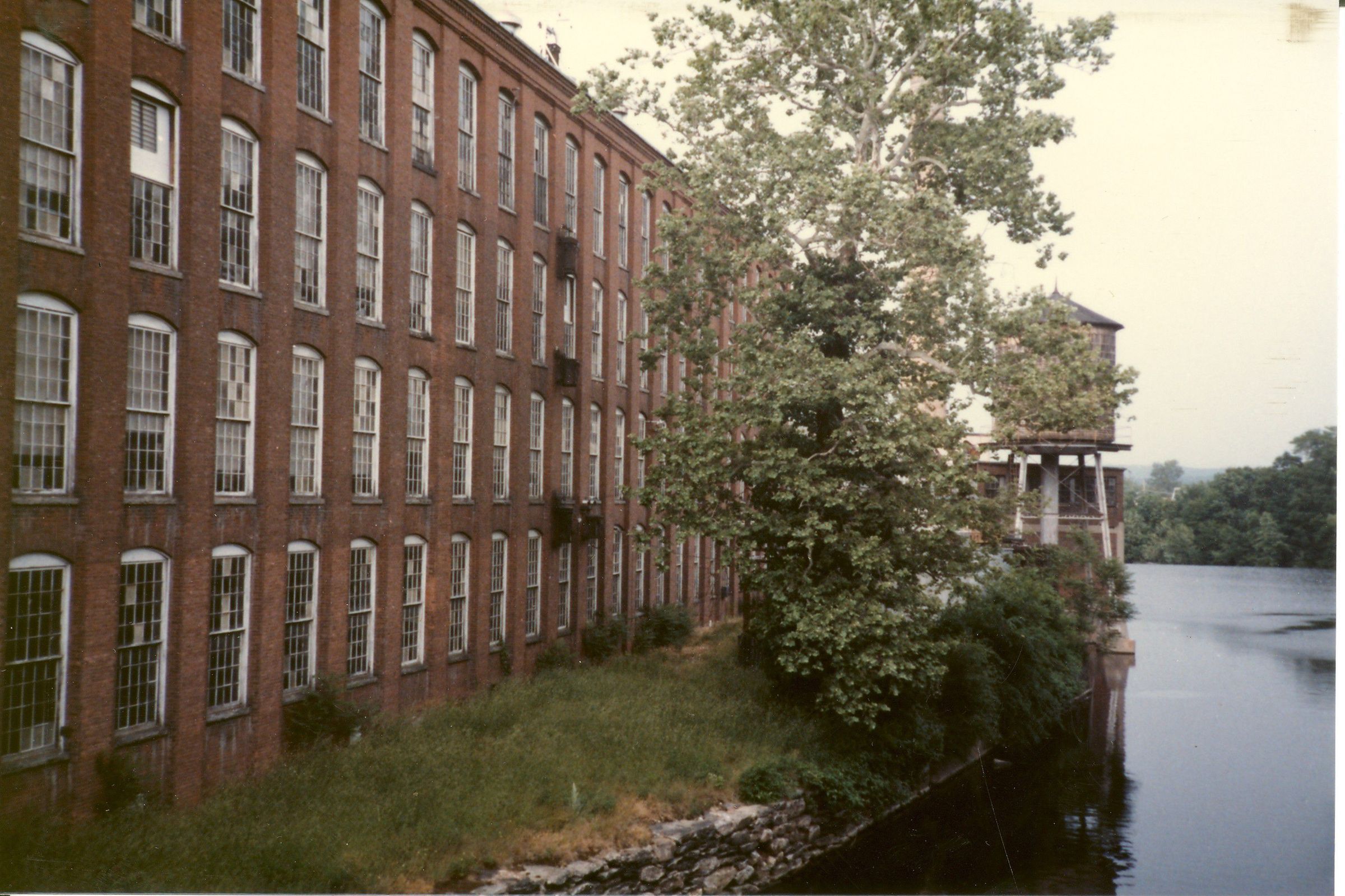 Color photographic print of Mill No. 5, American Thread Company, Willimantic, CT. Taken from the stone arch bridge (Garden on the Bridge), looking east. Unknown photographer. Taken c. 1987, shortly after ATCO closed its Willimantic plant.Photograph Details