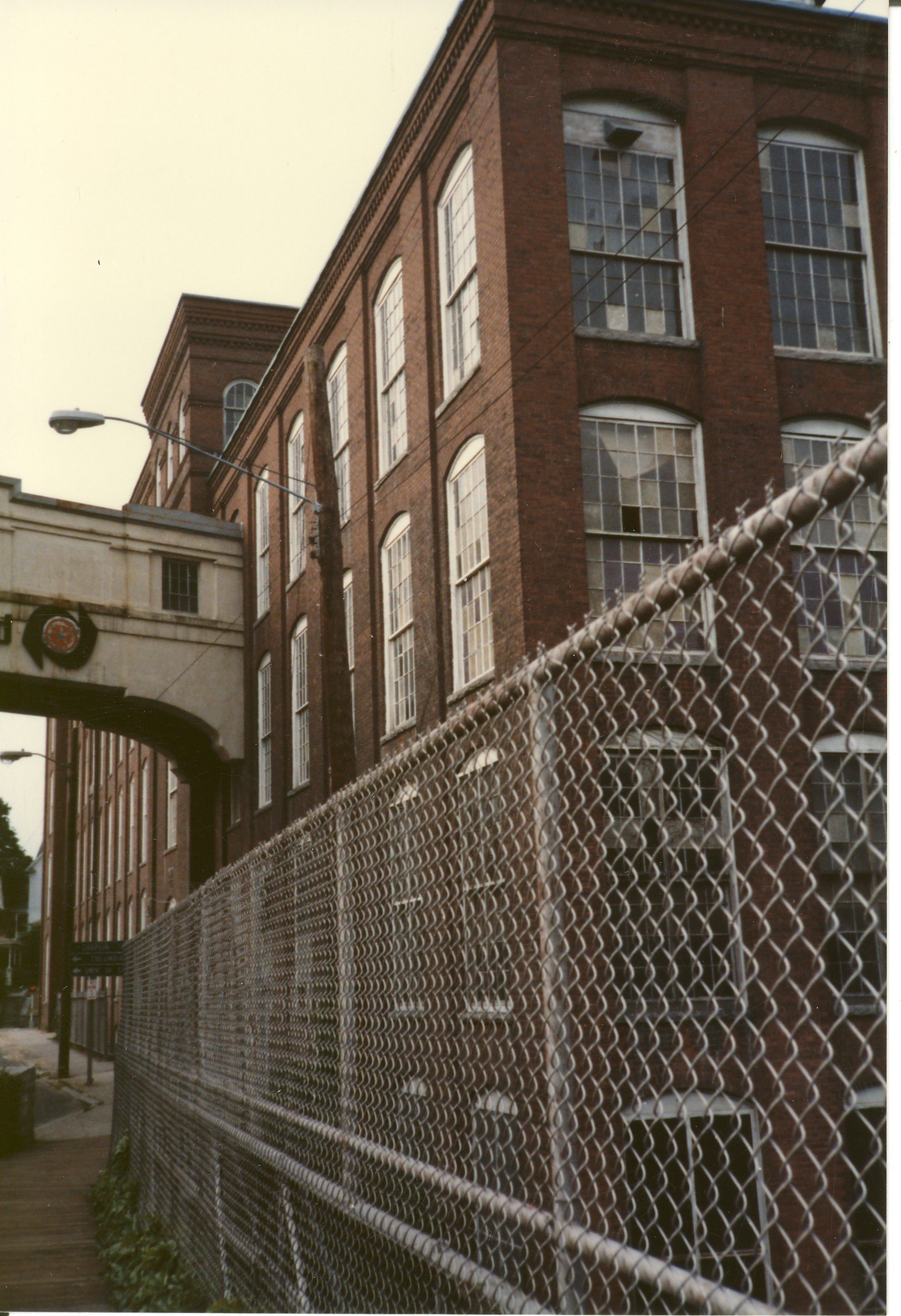 Color photographic print of Mill No. 5, American Thread Company, Willimantic, CT. Taken from the stone arch bridge (Garden on the Bridge). Unknown photographer. Taken c. 1987, shortly after ATCO closed its Willimantic plant.Photograph Details