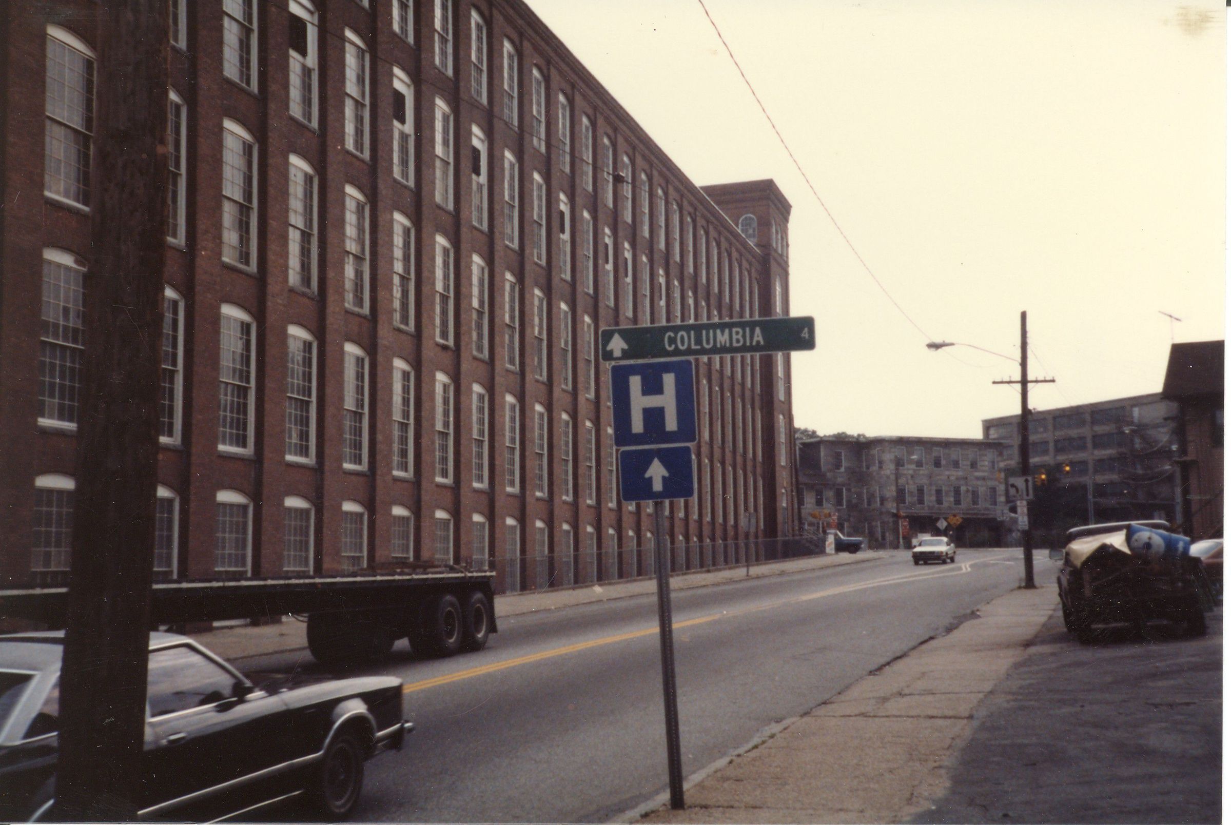 Color photographic print of Mill No. 6, American Thread Company, Willimantic, CT. Taken from Main Street. Unknown photographer. Taken c. 1987, shortly after ATCO closed its Willimantic plant.Photograph Details