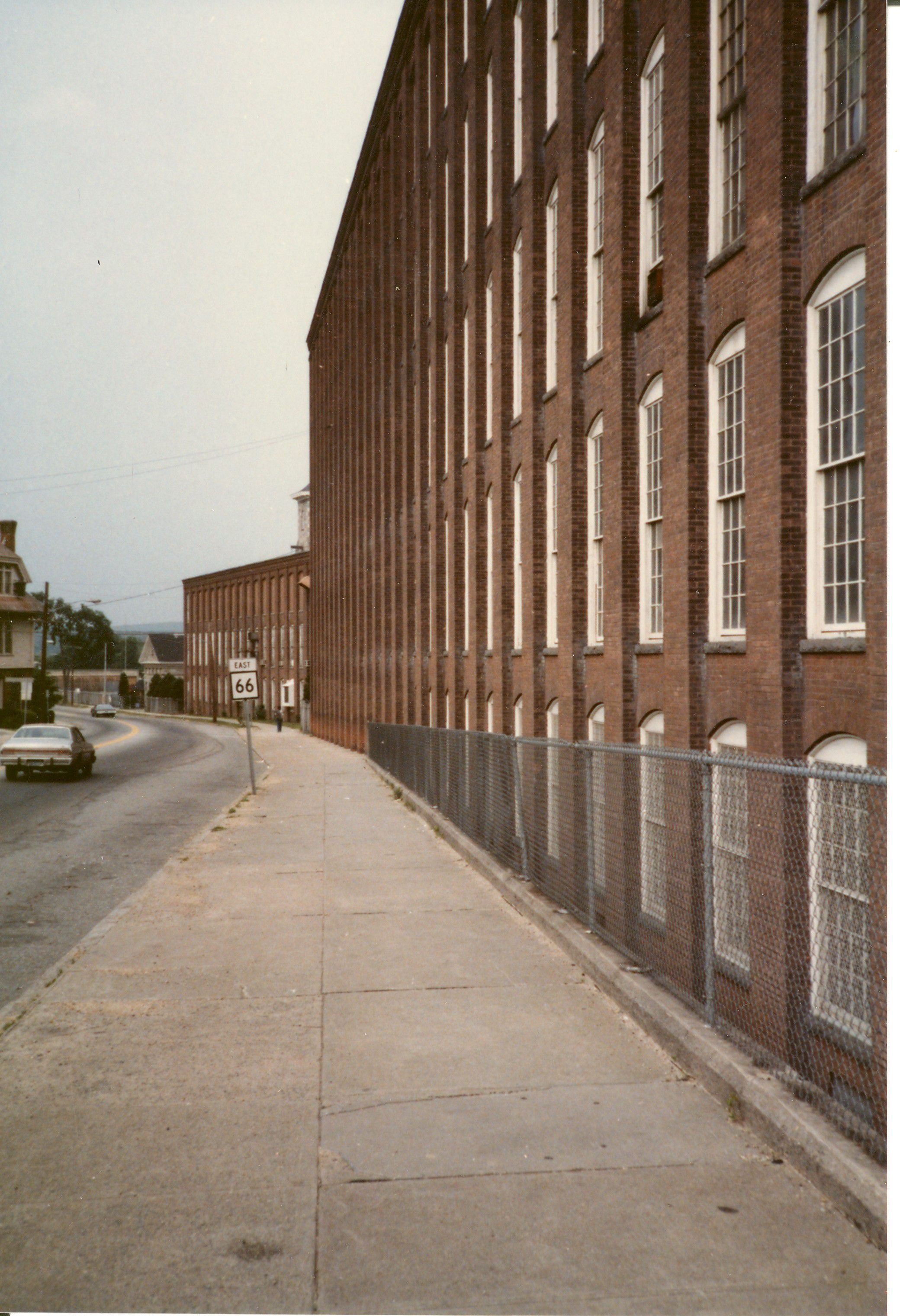 Color photographic print of Mill No. 6, with the Package Dye House in the distance, American Thread Company, Willimantic, CT. Unknown photographer. Taken c. 1987, shortly after ATCO closed its Willimantic plant.Photograph Details