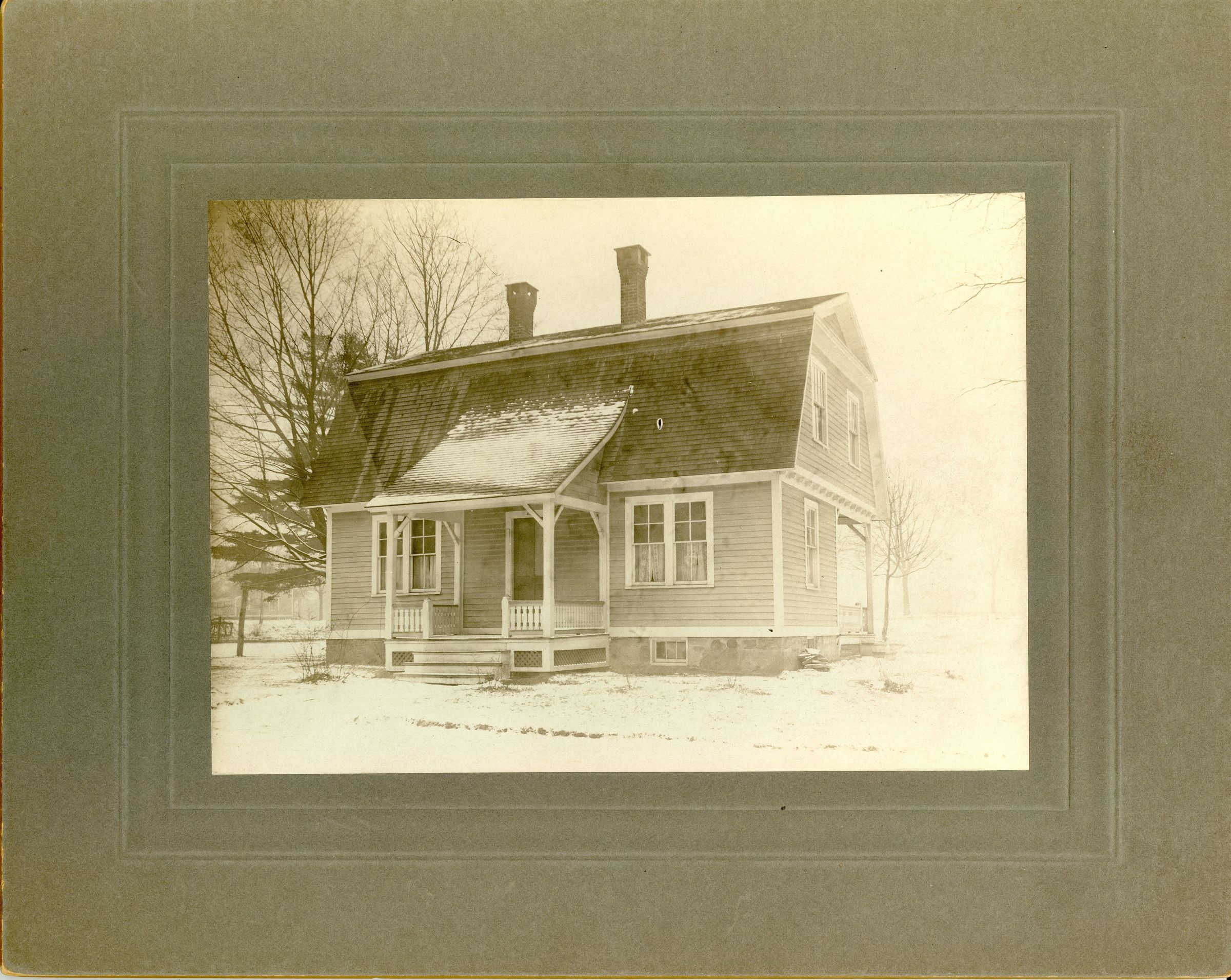 Black and white photographic print of mill worker housing, a cottage in "the Oaks," owned by the Willimantic Linen Company, Willimantic, CT. Unknown photographer. Taken c. 1890. The Oaks cottages were single-family units built in 1880 according to four different architectural plans on Quercus Avenue, Fairview Street, and Crescent Street in Willimantic. The Mill Museum holds the architecural plans in its collection, and they can be viewed elsewhere in this catalog. See, for example, 2022.4.71. The architect who designed the Oaks cottages was Eugene C. Gardner (see web link below).Photograph Details