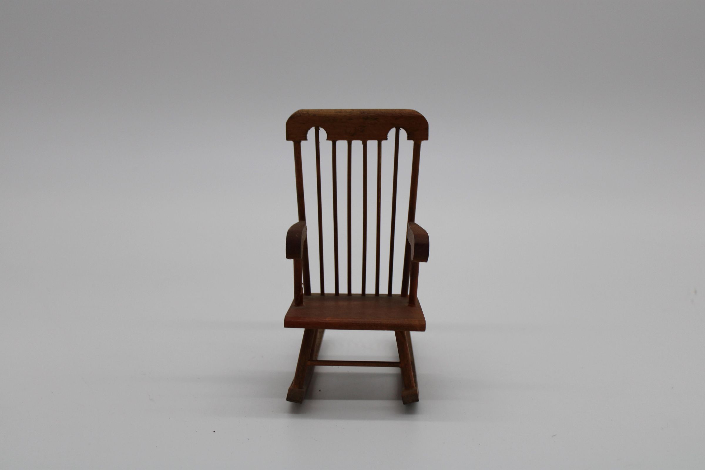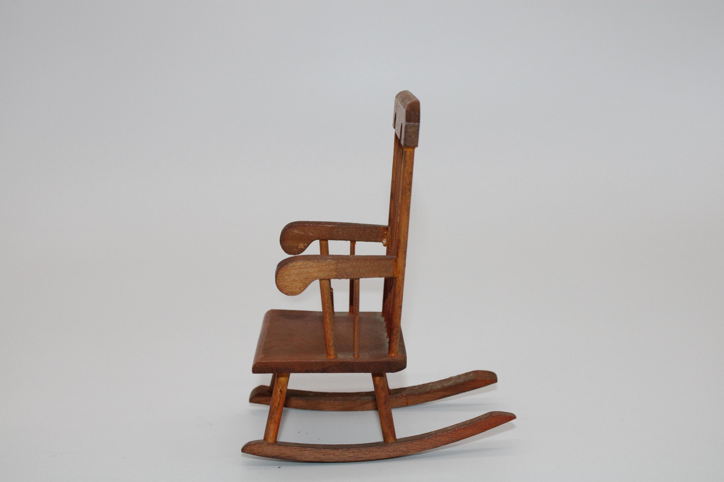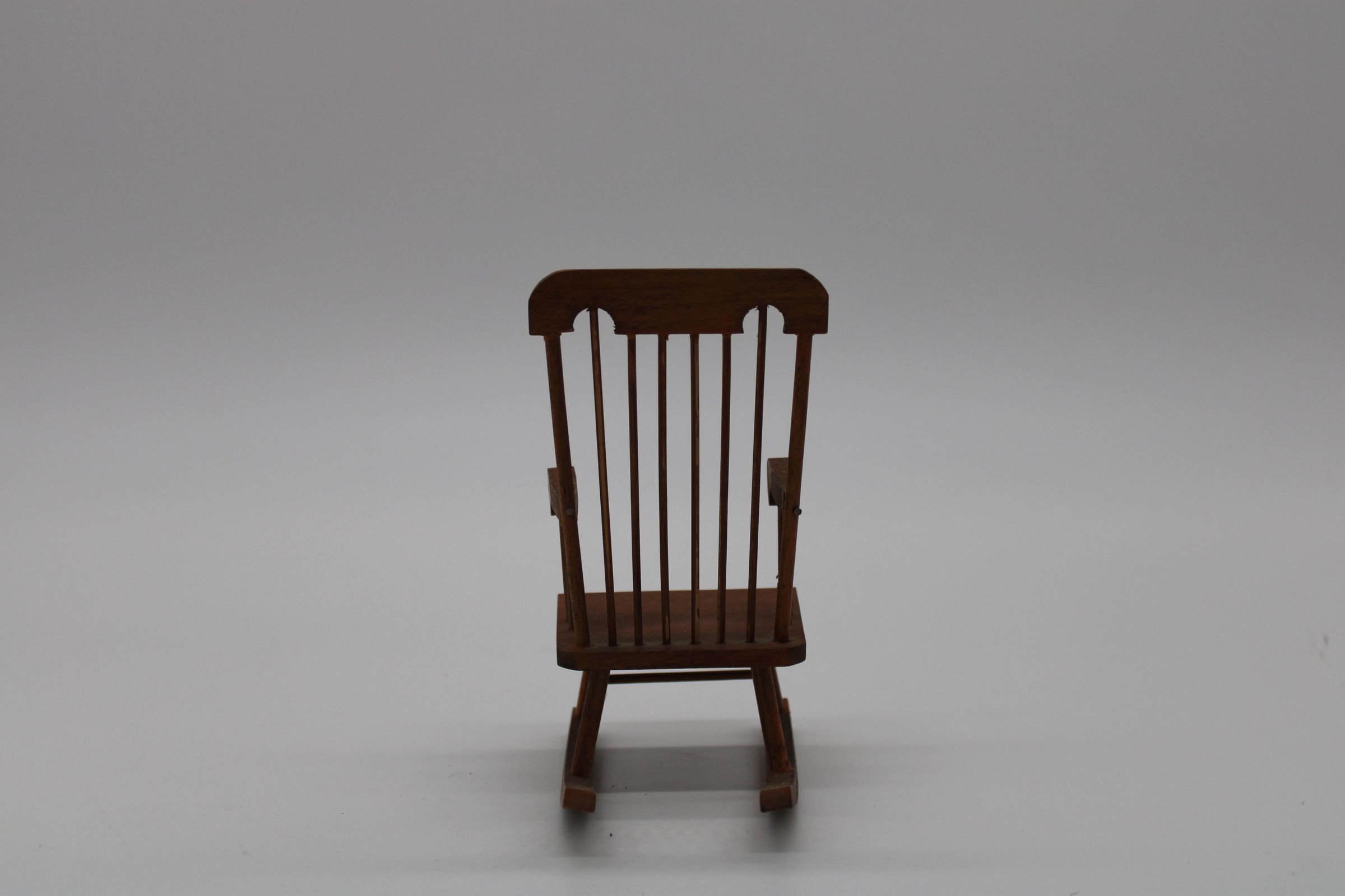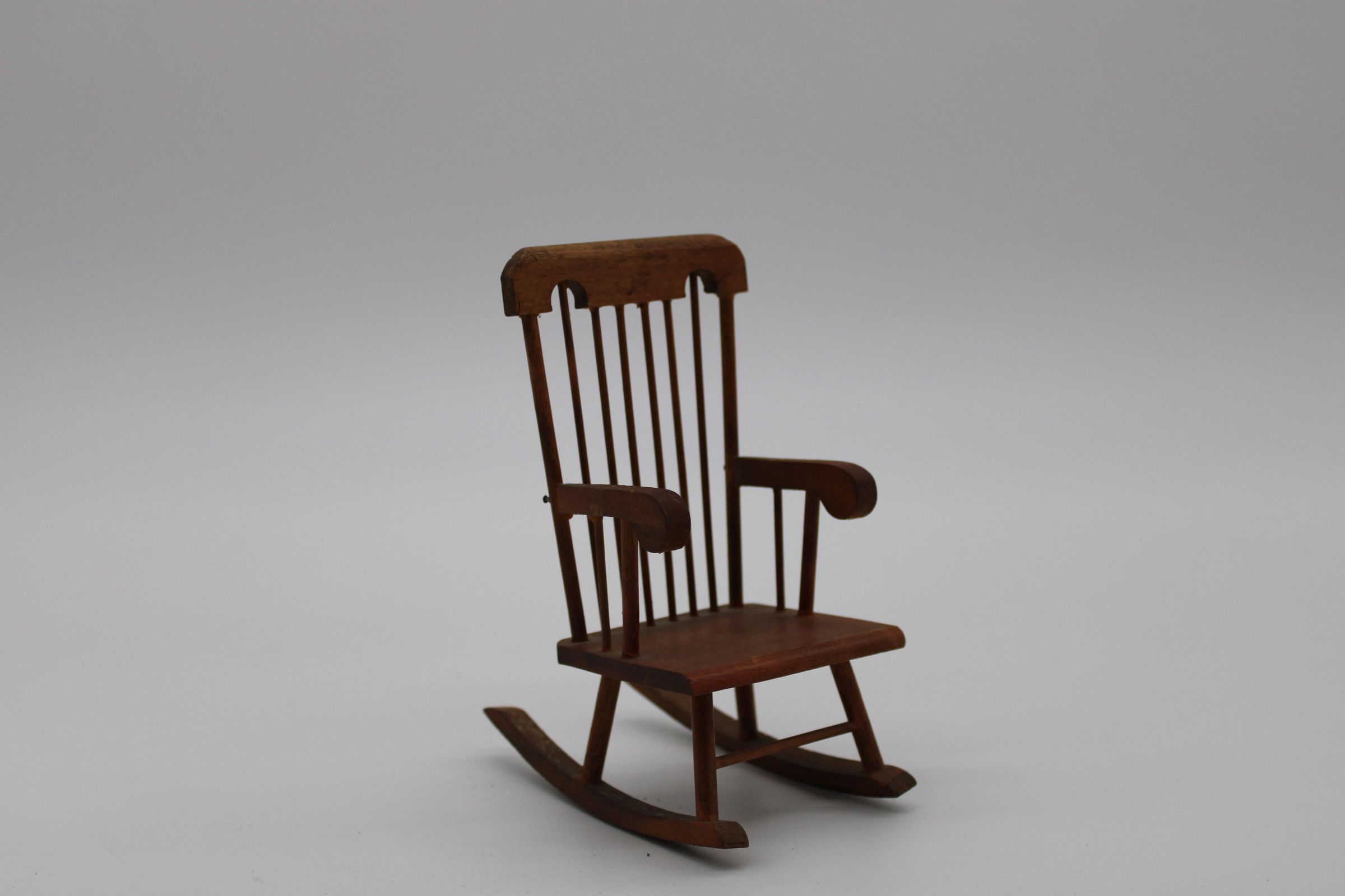 A small rocking chair, likely for use by a doll. Possibly a selling model from a traveling salesman.Made/Created