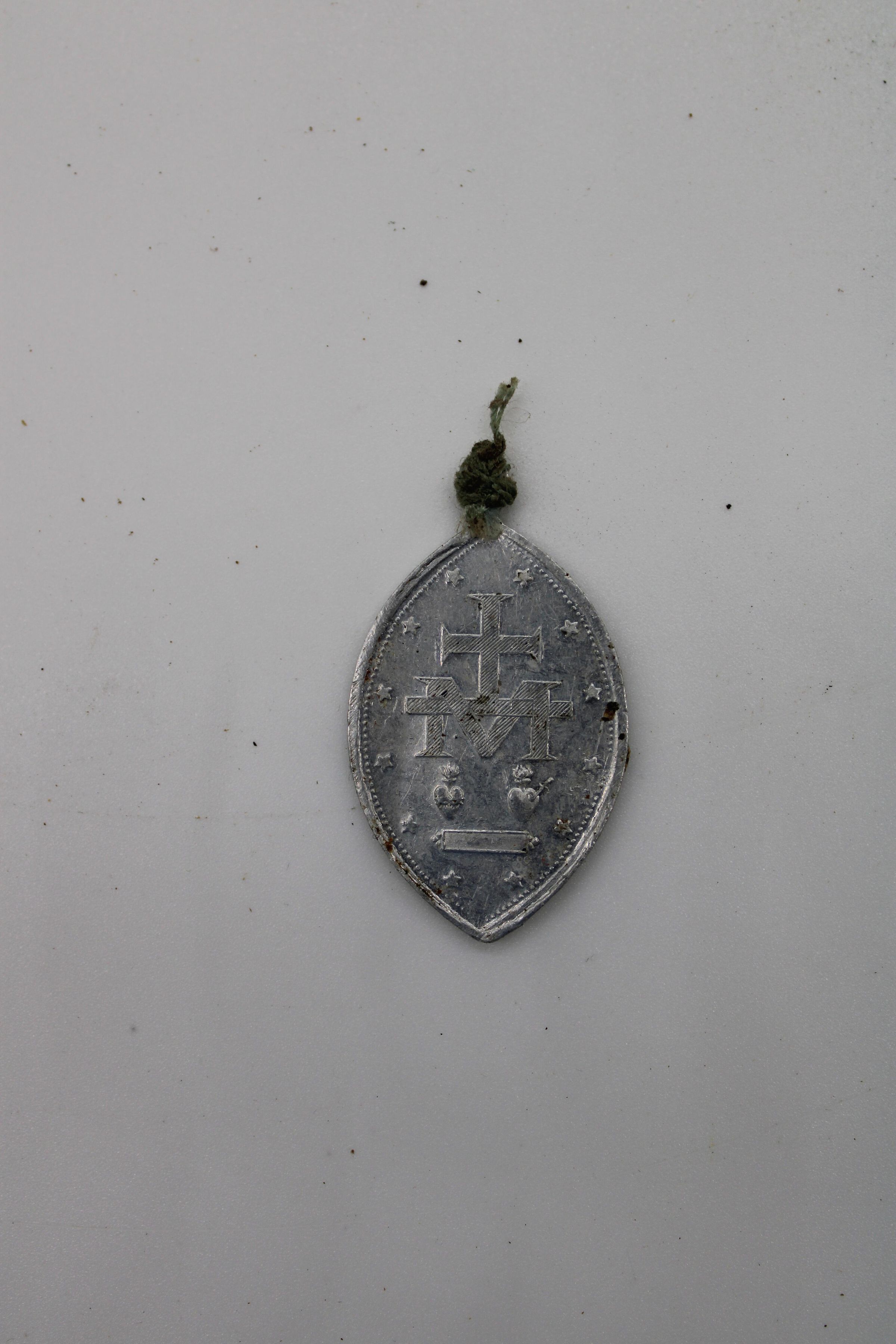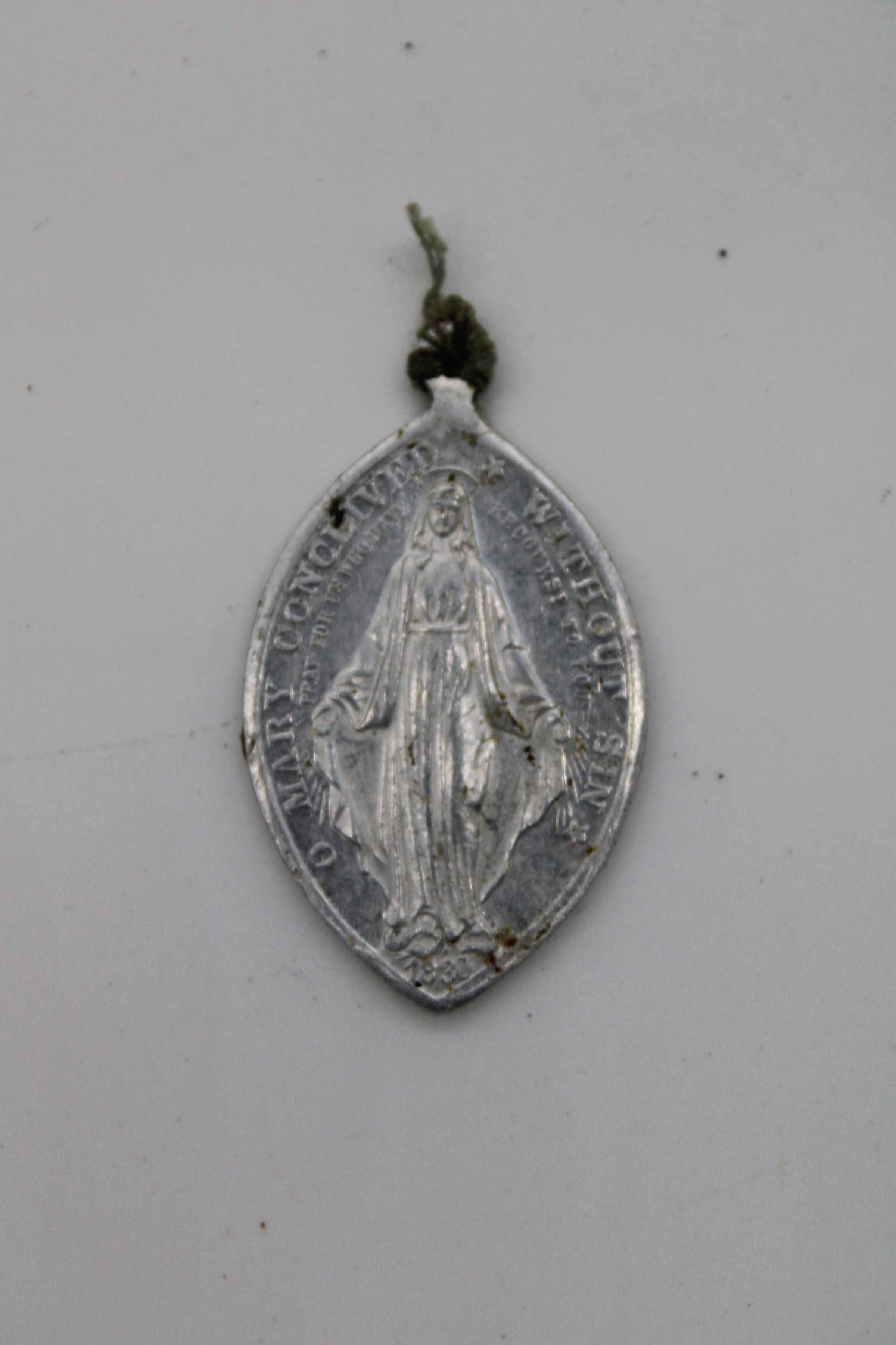 A seed-shaped pendant depicting the Virgin Mary of the Catholic tradition. The first side has dots and stars along the rim, with the letter M superimposed with a cross. The other side has a picture of the Virgin Mary, with text that reads "O MARY CONCEIVED WITHOUT SIN, PRAY FOR US WHO HAVE RECOURSE TO YOU".Location