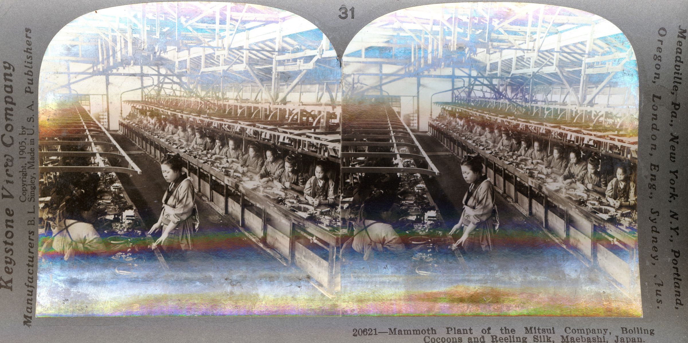 Stereograph of silk worker inside Mitsui Company factory, Maebashi, Japan, 1905. Card is warped.Photograph Details