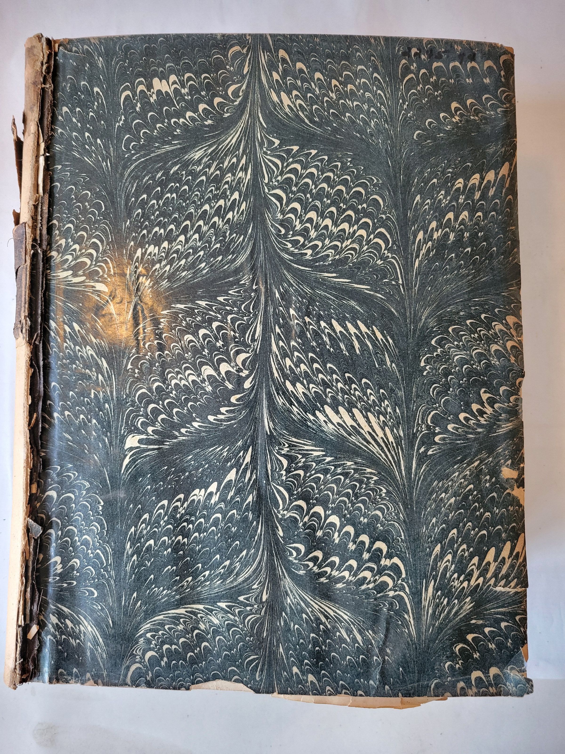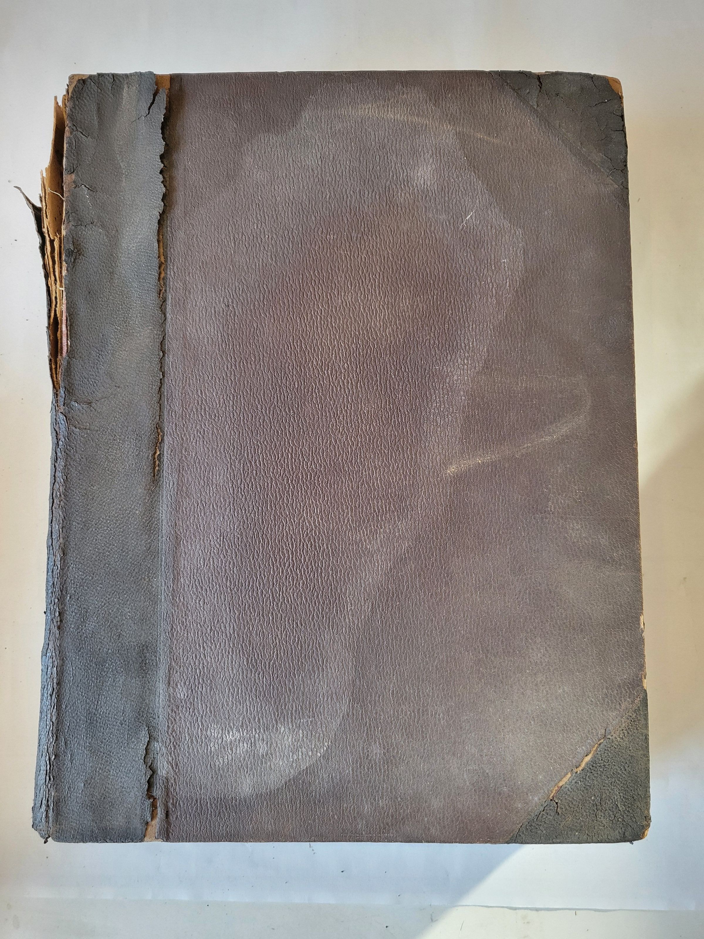 A set of illustrated books describing various procedures pertaining to machining in a home or professional metal shop. The covers of the first volume are water damaged and the leather binding, which shows the title and edition i gold ink, is tearing and crumbling. The second volume's cover is missing entirely, leaving only the flyleaf which features a swirling ink pattern popular at the time of publication.Collection