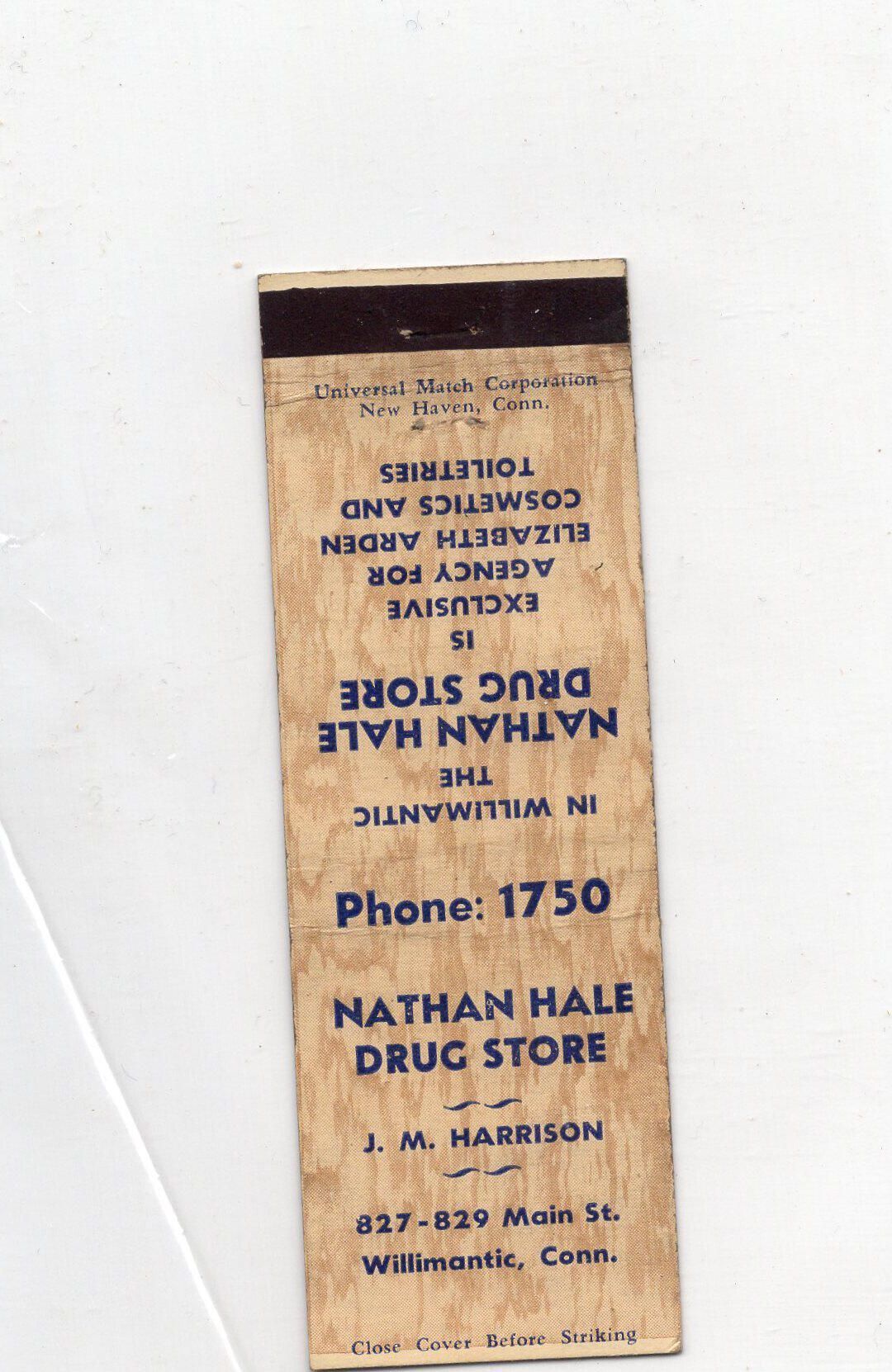 A Nathan Hale drug store Match Bookwith an advertisement of the store which was located on 827-829 Main St. Willimantic, Conn.Condition