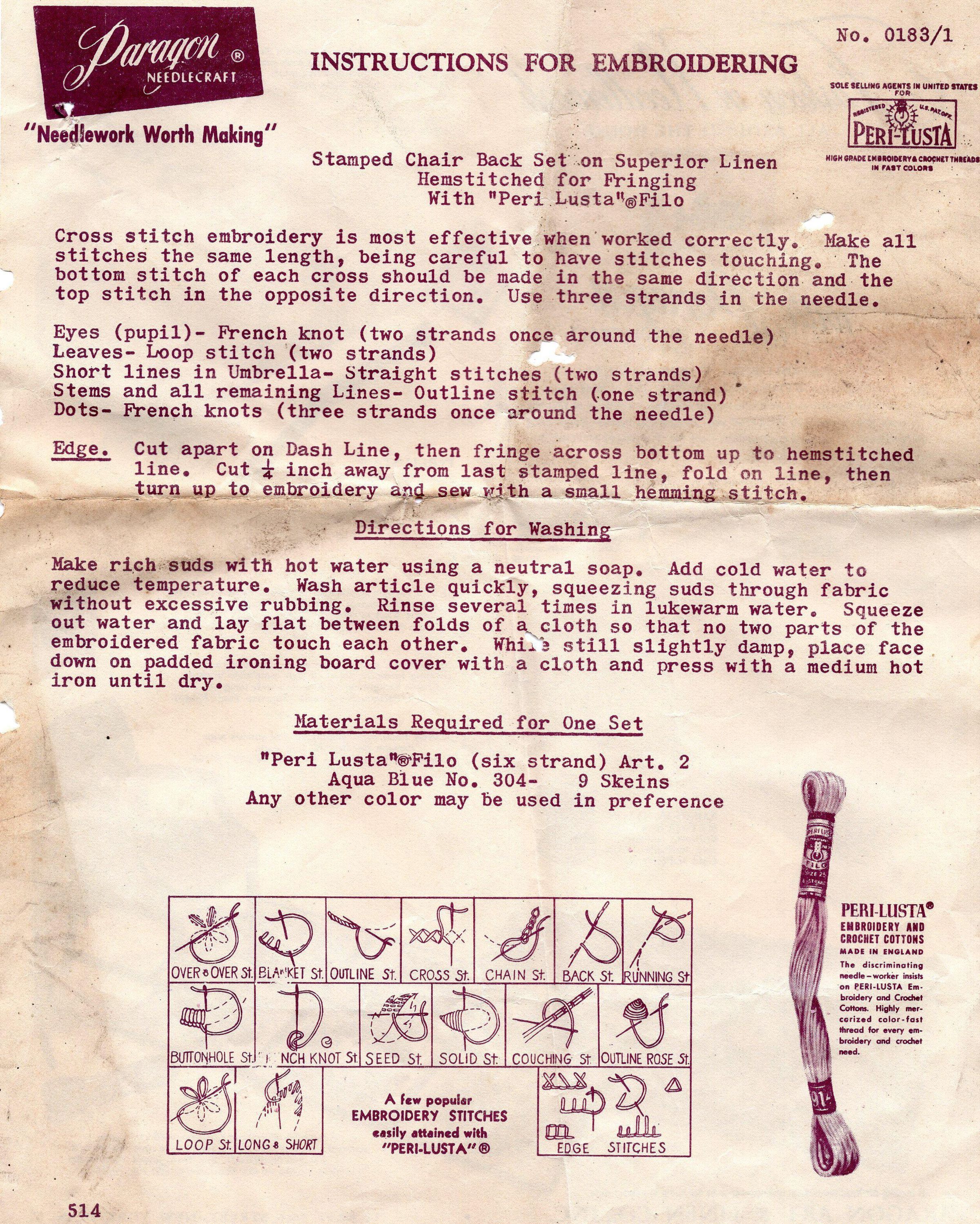 Instructional sheet that would have come with a printed linen piece of fabric. The fabric would have a pattern printed on it with water soluble ink.Created By
