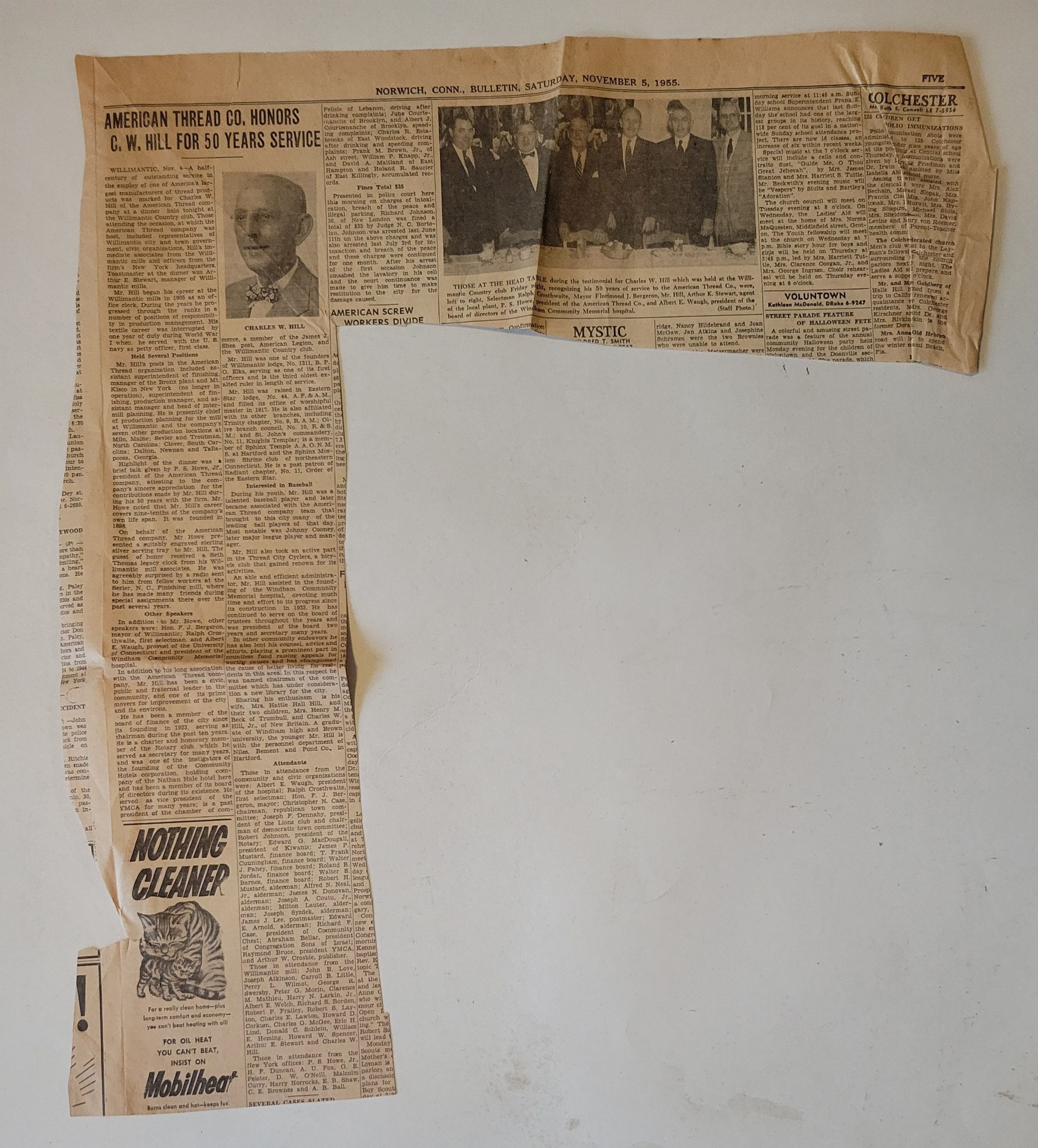 A newspaper clipping from the Norwich Bulletin of the article "American Thread Co. Honors C.W. Hill for 50 Years Service," dated November 5, 1955. The article details Charles W. Hill's service to the American Thread Co. as well as the event to honor him, held November 4, 1955. It features a portrait of Hill as well as a photograph of Hill and five other men in attendance at the event, Ralph Crosthwaite, Mayor Florimond J. Bergeron, Arthur K. Stewart, P.S. Howe (president of American Thread), and Albert E. Waugh. The article is cut roughly from the rest of the page in an "L" shape and is torn, creased, and crumpled in multiple places.Collection