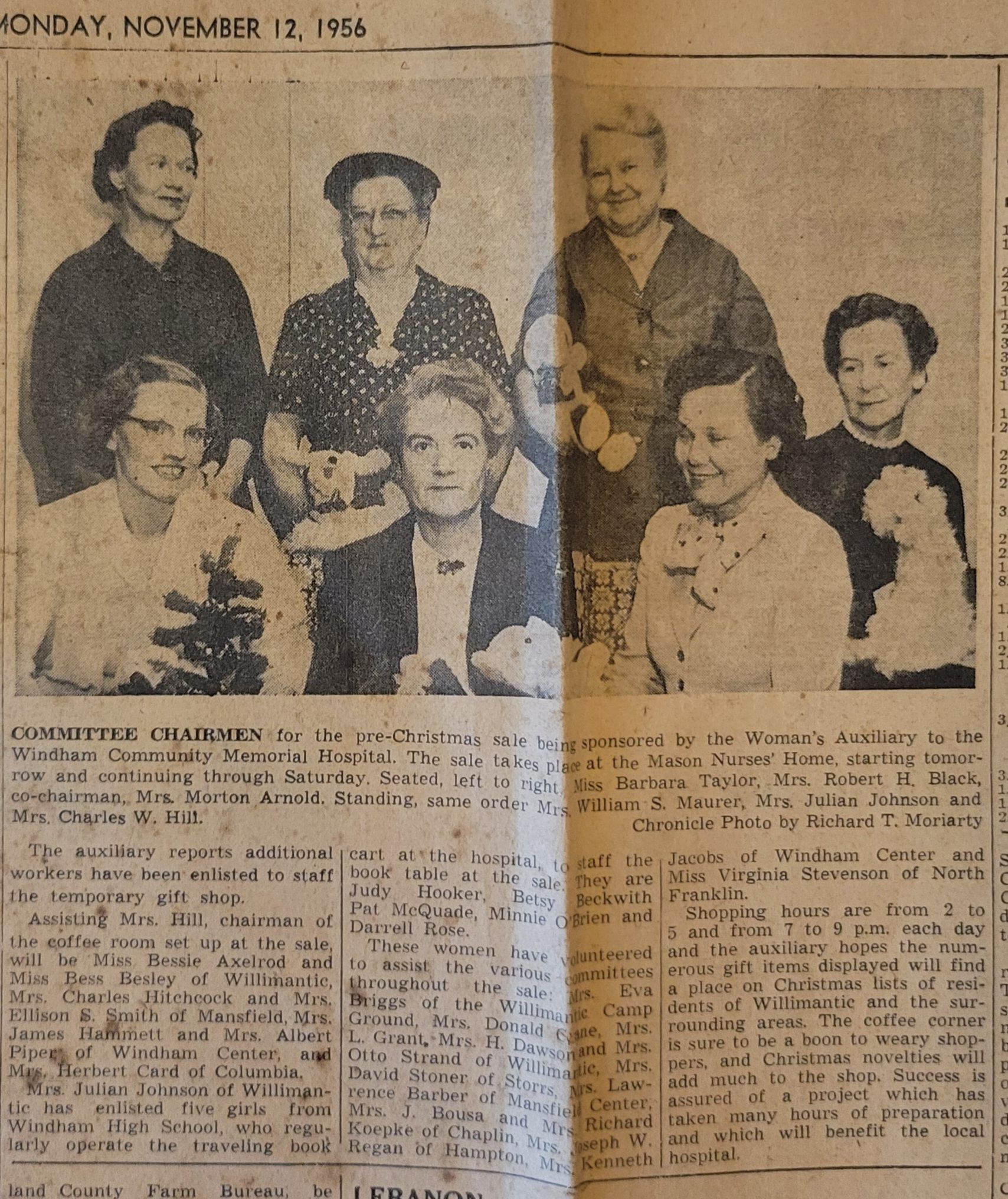 A newspaper clipping from the Willimantic Daily Chronicle of a short article and photograph of the committee chairmen for the pre-Christmas sale put on by the women's auxiliary to the Windham County Memorial hospital. The photograph features, left to right and top to bottom, Mrs. William S. Maurer, Mrs. Julian Johnson, Mrs. Charles W. Hill, Miss Barbara Taylor, Mrs. Robert H. Black, and Mrs. Morton Arnold. The seventh woman in the photograph is unnamed. Photograph by Richard T. Moriarty. The article gives the details of the pre-Christmas sale to benefit the hospital and lists all committee members and volunteers involved, it is dated November 12, 1956.Collection