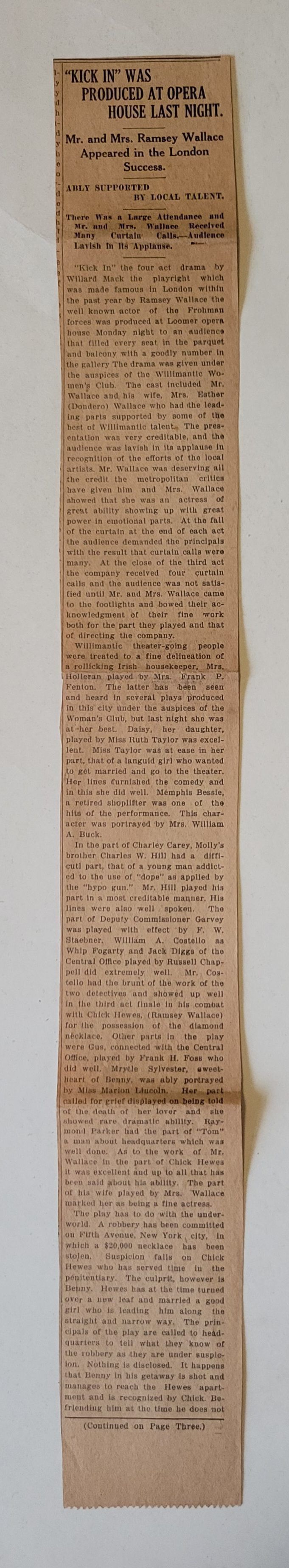 Newspaper clipping of the article "'Kick In' Was Produced at Opera House Last Night." The article describes the performance at the Loomer Opera House on June 12, 1916. The performance featured well-known actors Mr. and Mrs. Ramsey Wallace, and the article includes a favorable review of the performance of local Charles W. Hill. The article continues on another page which is not included.Collection