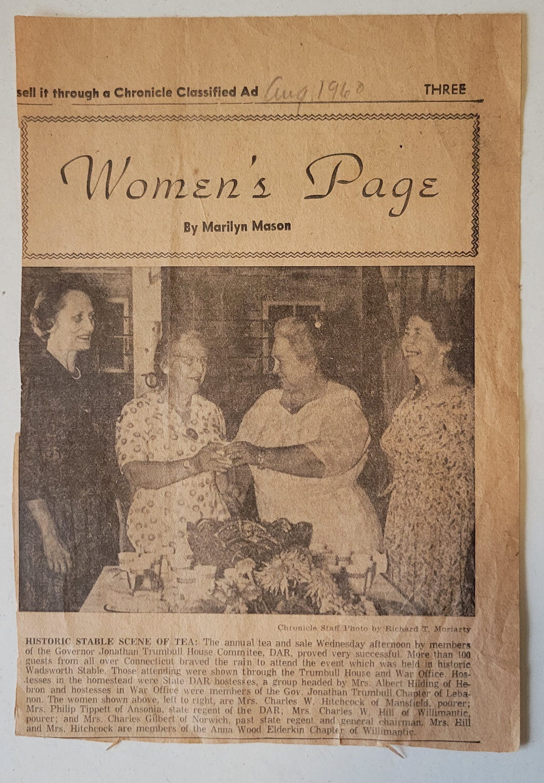 A newspaper clipping of the "Women's Page" by Marilyn Mason. The clipping is dated in handwritten pencil, August, 1960. It features a captioned photograph titled "Historic Stable Scene of Tea" and details an annual tea hosted by the Governor Johnathan Trumbull House Committee of the DAR. In the photograph, left to right, are Mrs. Charles W. Hitchcock, Mrs. Philip Tippet, Mrs. Charles W. Hill (Hattie), and Mrs. Charles Gilbert. Photograph by Richard T. Moriarty.Collection