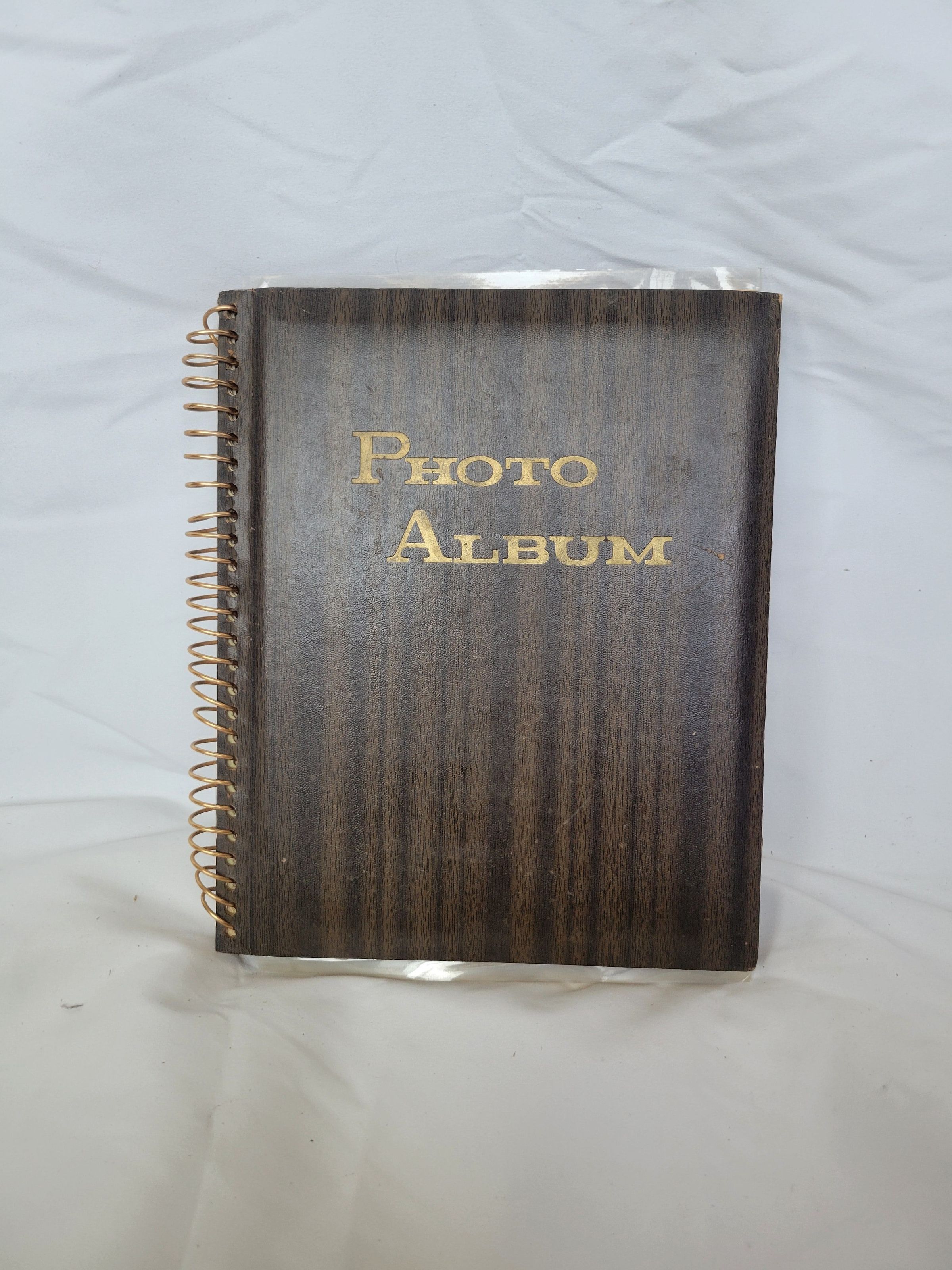 A photo album containing photographs from Harold and Helen Nichols's 50th wedding anniversary party. The album is spiral bound with a plastic cover made to look like wood paneling. Inside, the pages are yellowed with age, holding three photographs on each, and encased in plastic sleeves. the photographs themselves appear to be in good condition.Collection