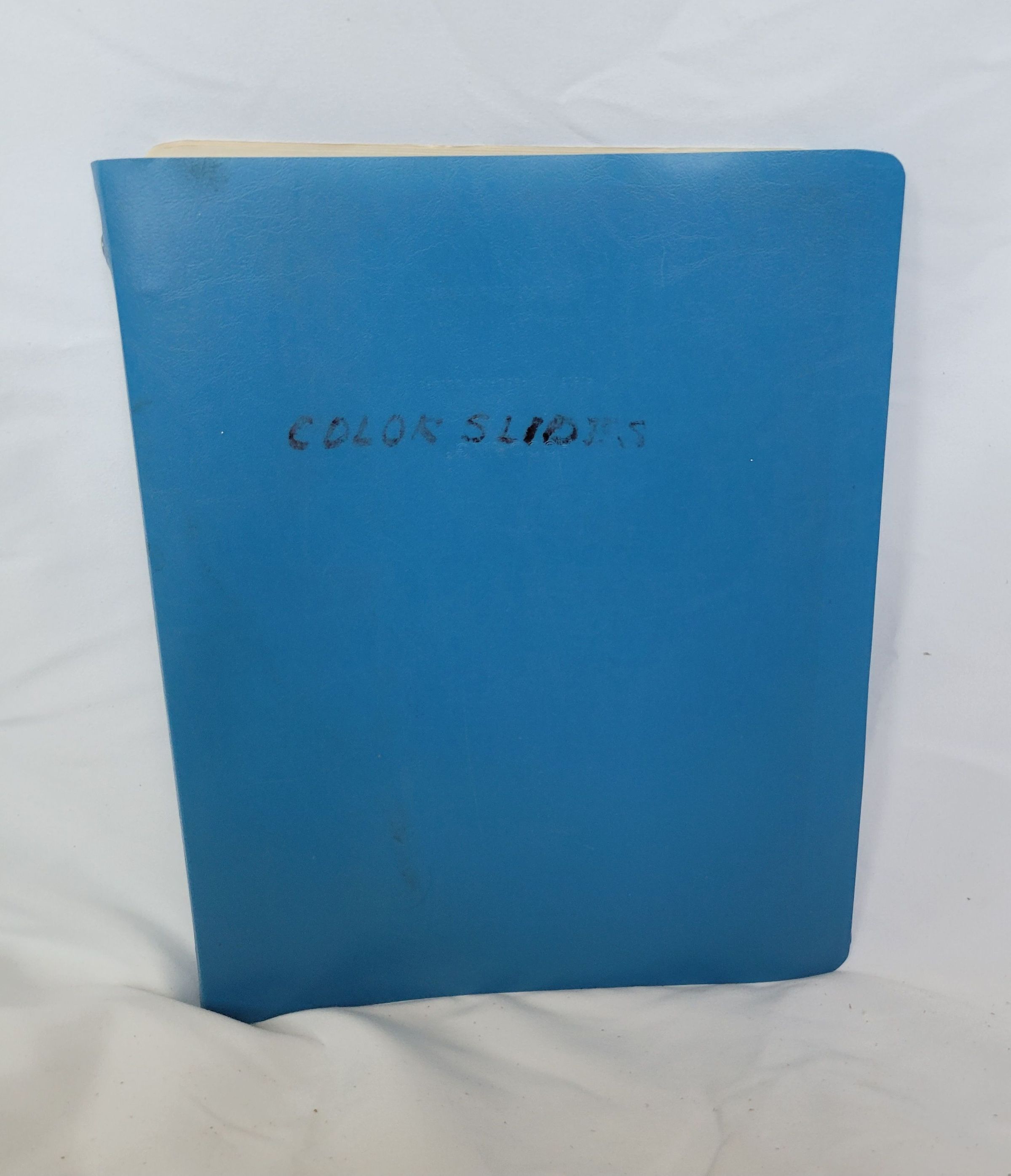 A list of slides compiled by Harold Nichols. The collection, housed in a blue plastic binder labeled "color slides," is made up of lined sheets of paper, each of which hosts a titled collection of slides with numbers and descriptions. The entries range in date from 1953 to 1967. The slides themselves are not included.Collection