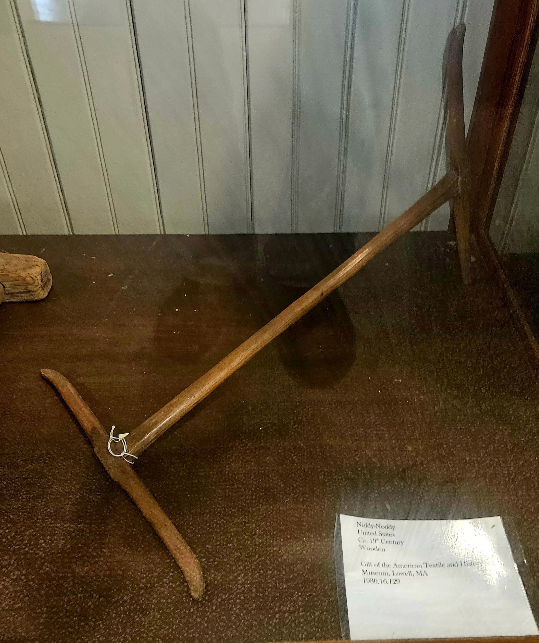Niddy-noddy. Wood, mortise and tenoned. Round central shaft widens to rectangle at end. A cross-bar is affixed with mortise and tenon joint at each end of shaft, secured by two pins; cross-bars are set at right angles to one another; inside edge of cross-bar is straight and outside edge bow out at center. Three of four ends are upturned.Use