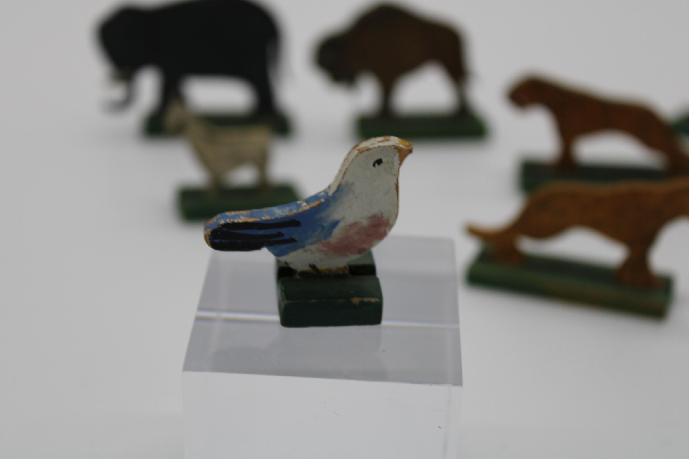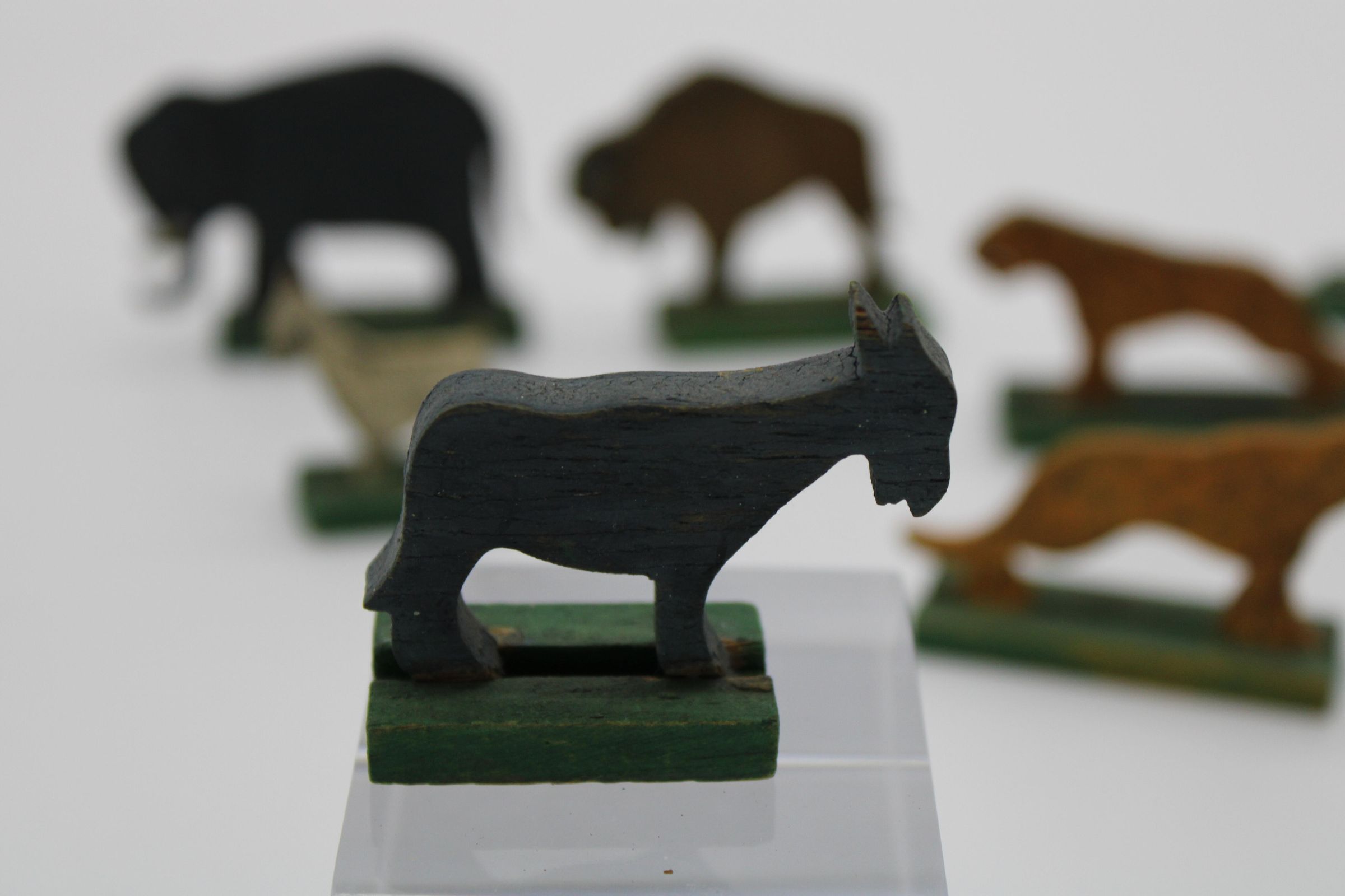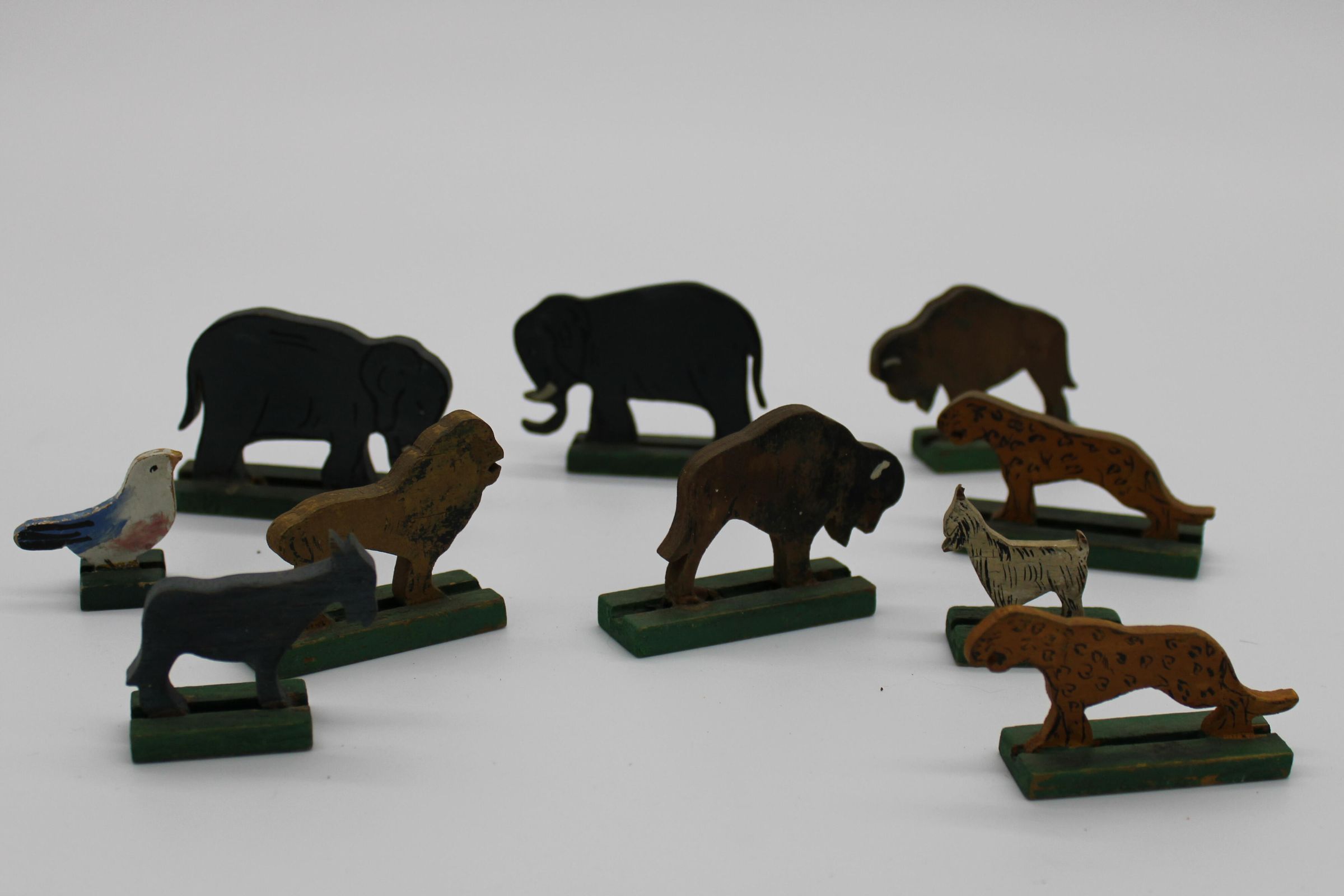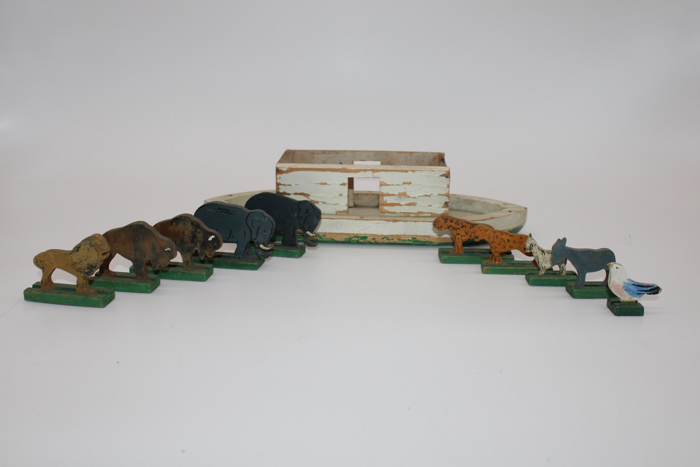 A toy boat and series of animal figurines meant to represent the Christian, Islamic, and Jewish story of Noah's Arc. Along with the boat are two elephants, two bison/buffalo, one lion, two cheetahs, two goats, and a bluebird. May have been used as a bath toy based on the damage to the boat. WoodenCreated By