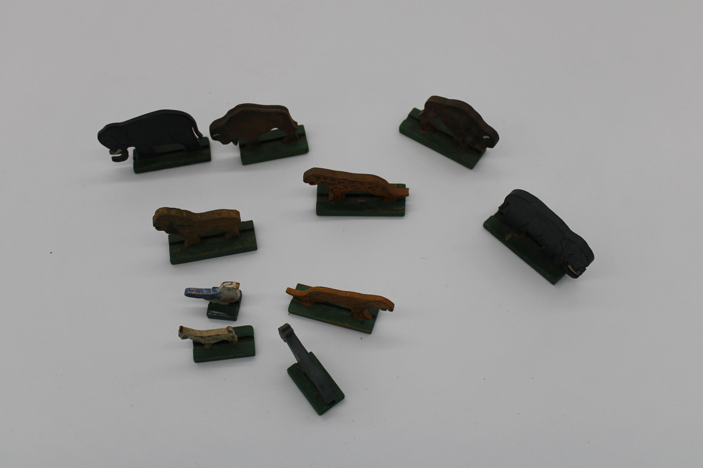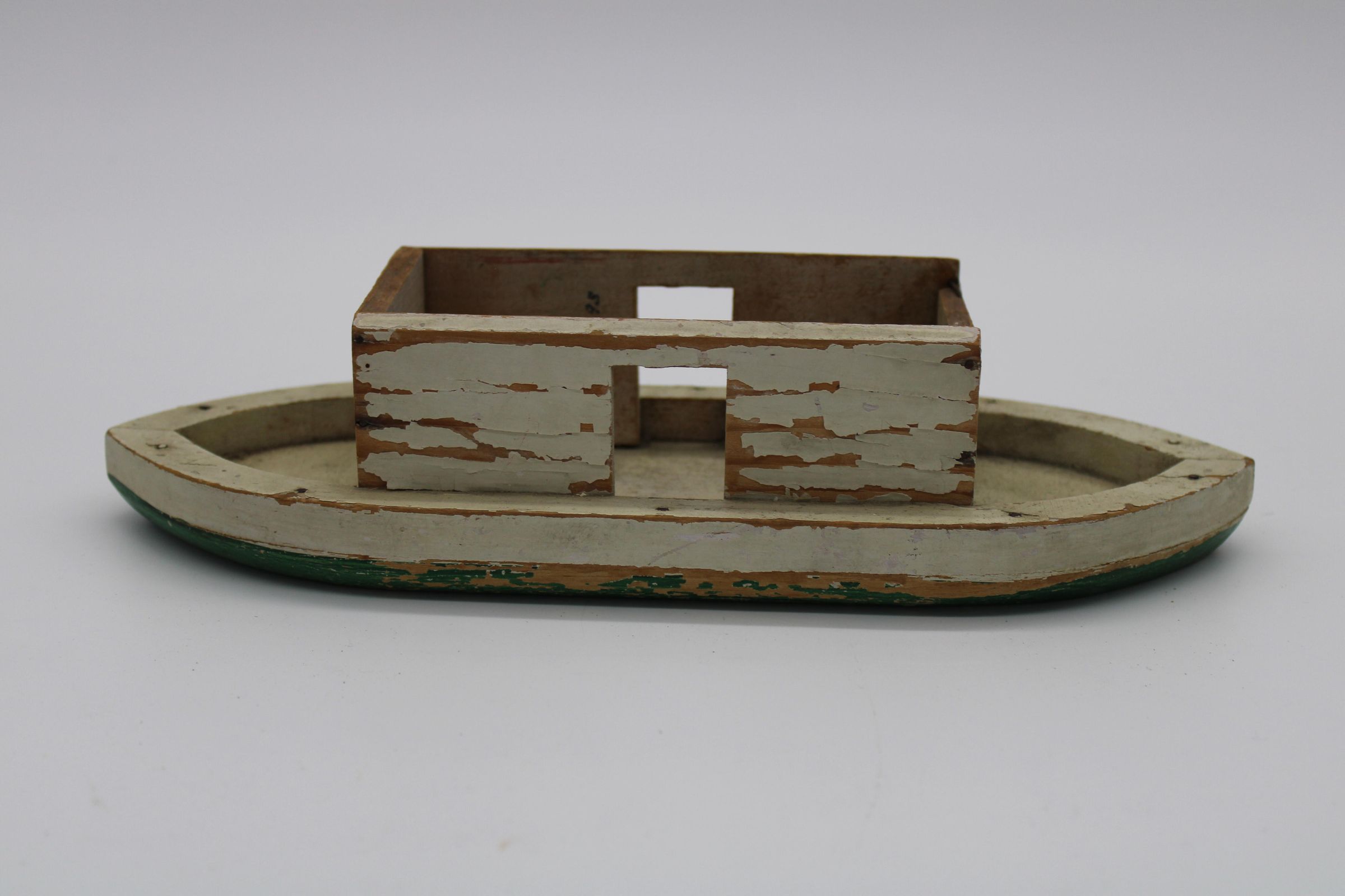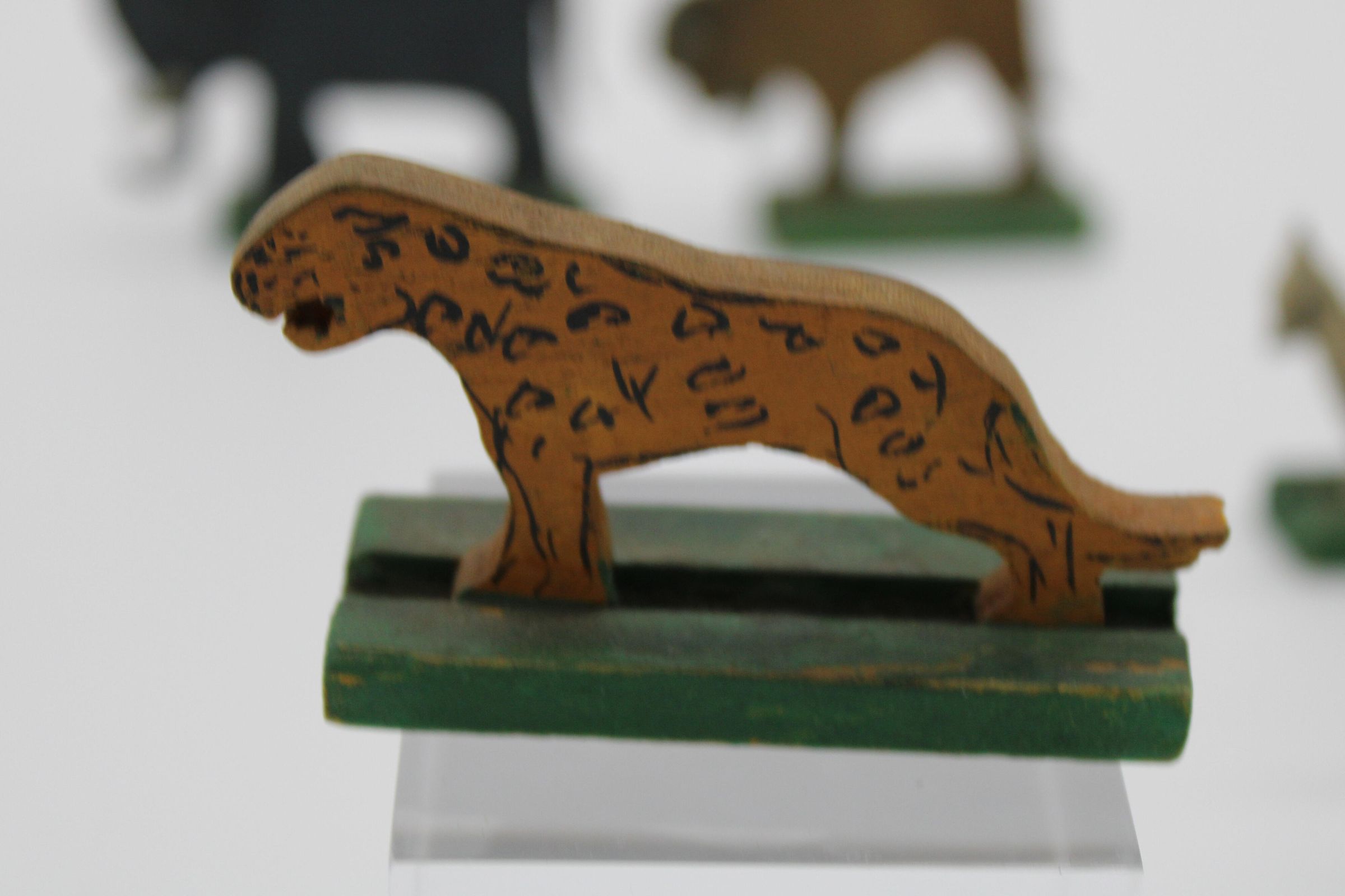 A toy boat and series of animal figurines meant to represent the Christian, Islamic, and Jewish story of Noah's Arc. Along with the boat are two elephants, two bison/buffalo, one lion, two cheetahs, two goats, and a bluebird. May have been used as a bath toy based on the damage to the boat. WoodenCreated By