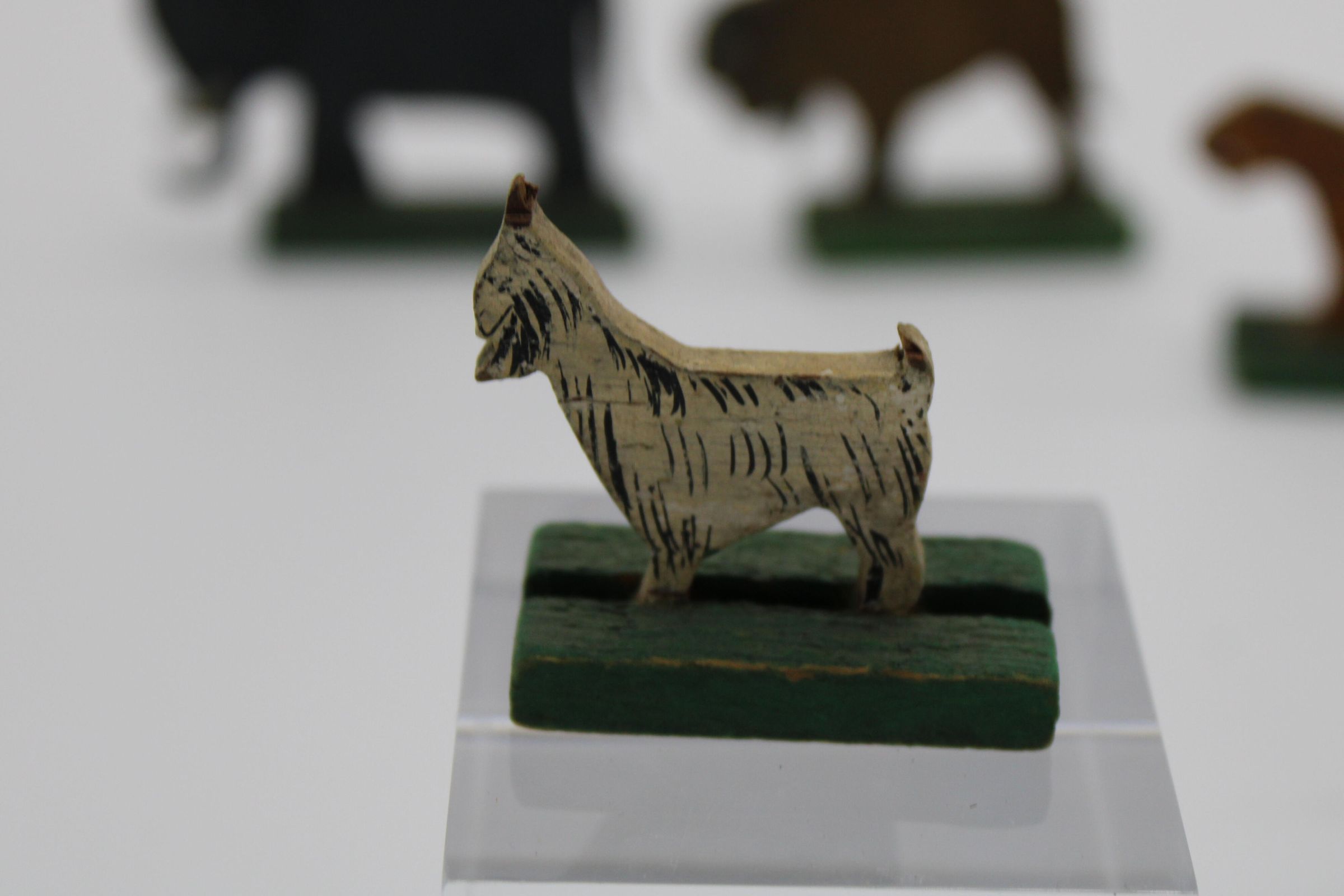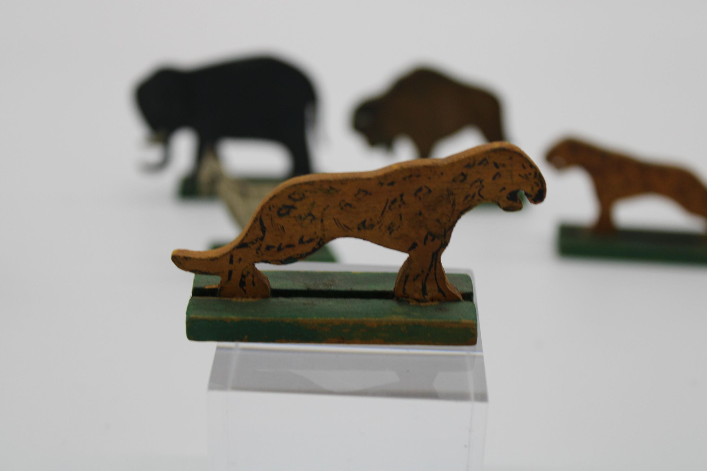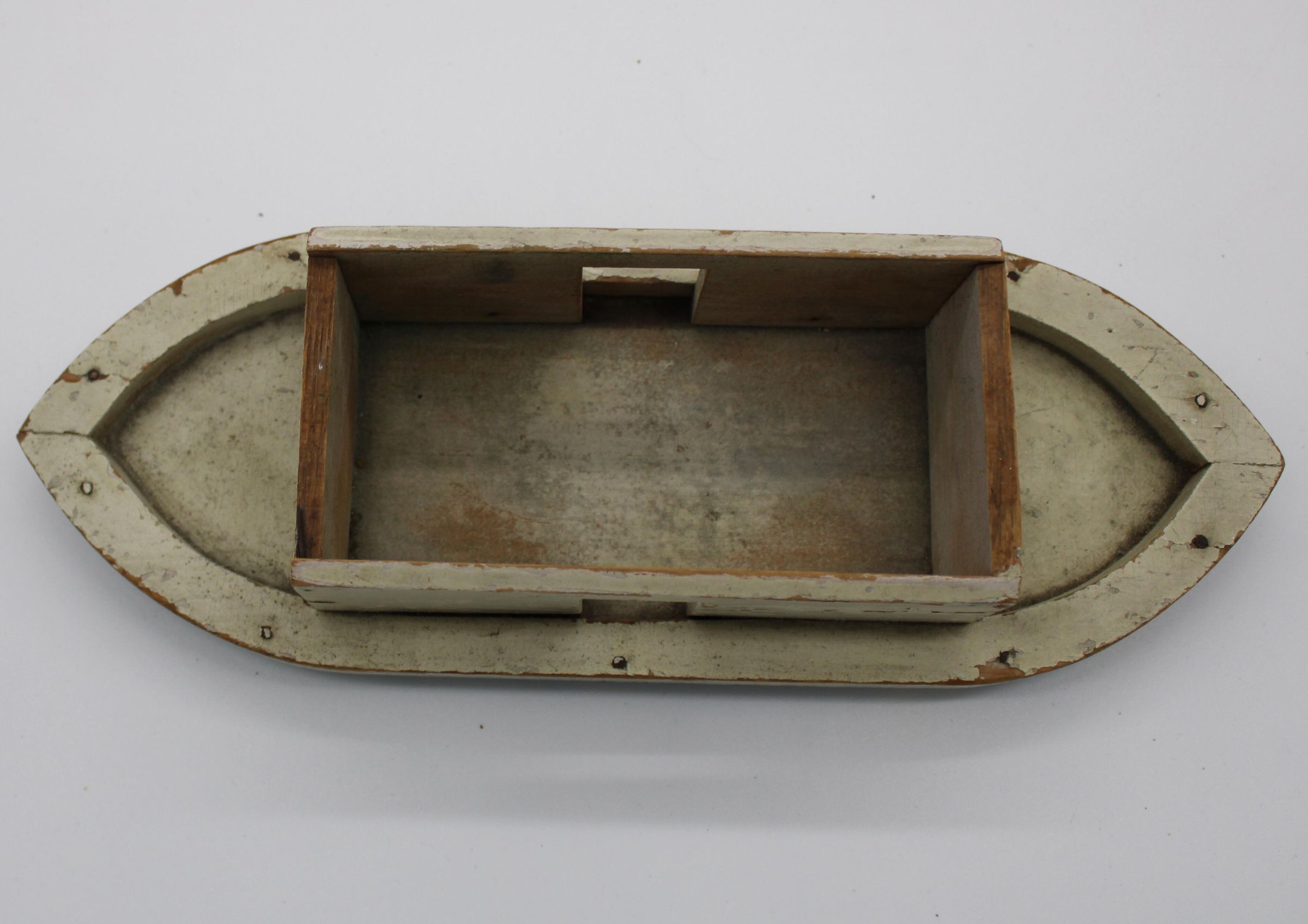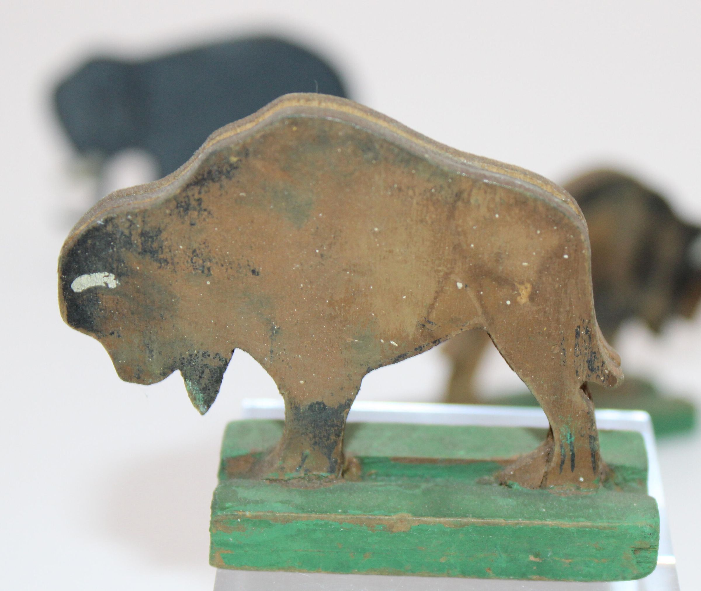 A toy boat and series of animal figurines meant to represent the Christian, Islamic, and Jewish story of Noah's Arc. Along with the boat are two elephants, two bison/buffalo, one lion, two cheetahs, two goats, and a bluebird. May have been used as a bath toy based on the damage to the boat. WoodenCreated By