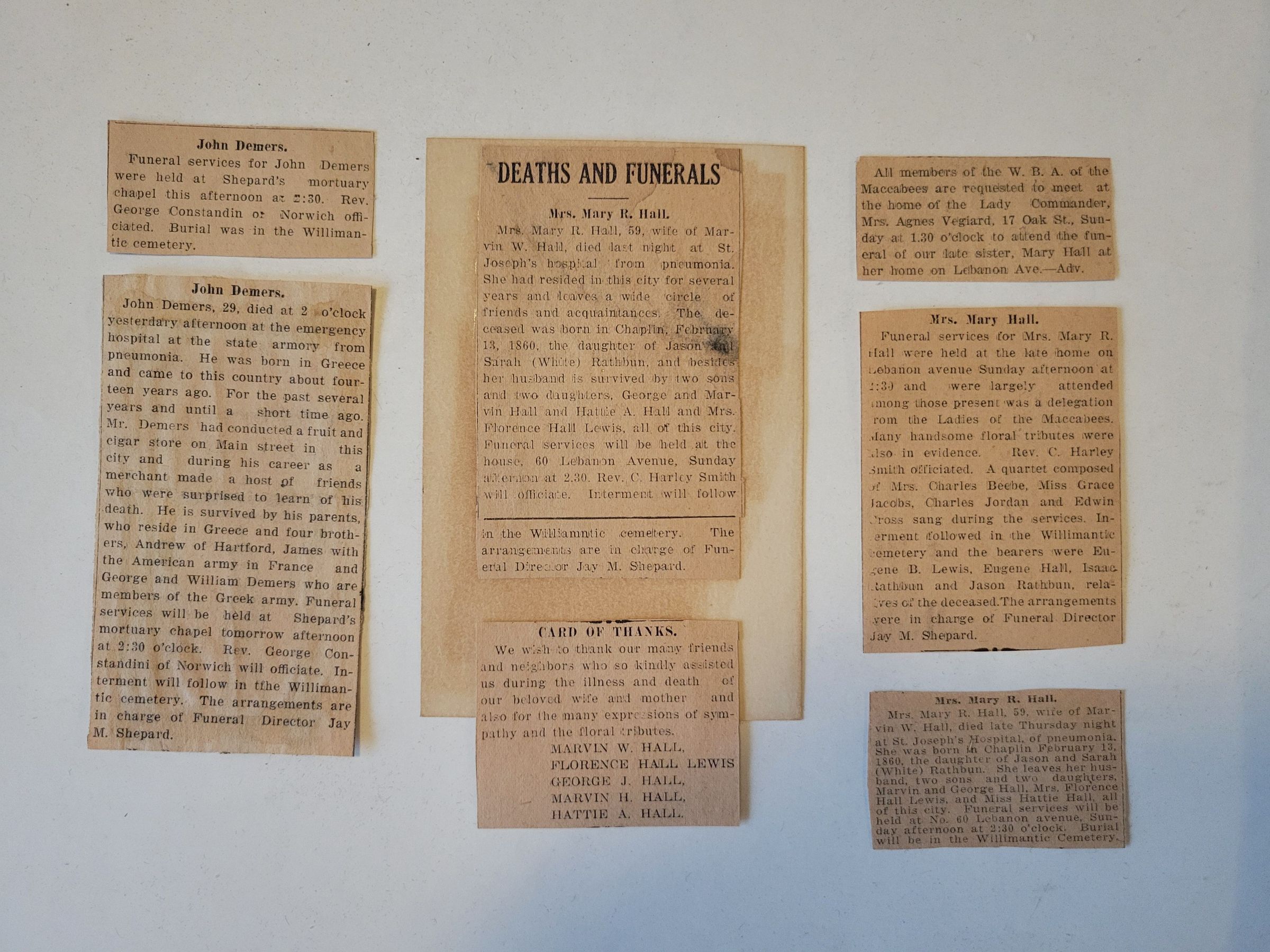 Obituaries for Mary R. Hall and John Demers, both of whom died in 1919 and were interred in Willimantic, Cemetery.Collection