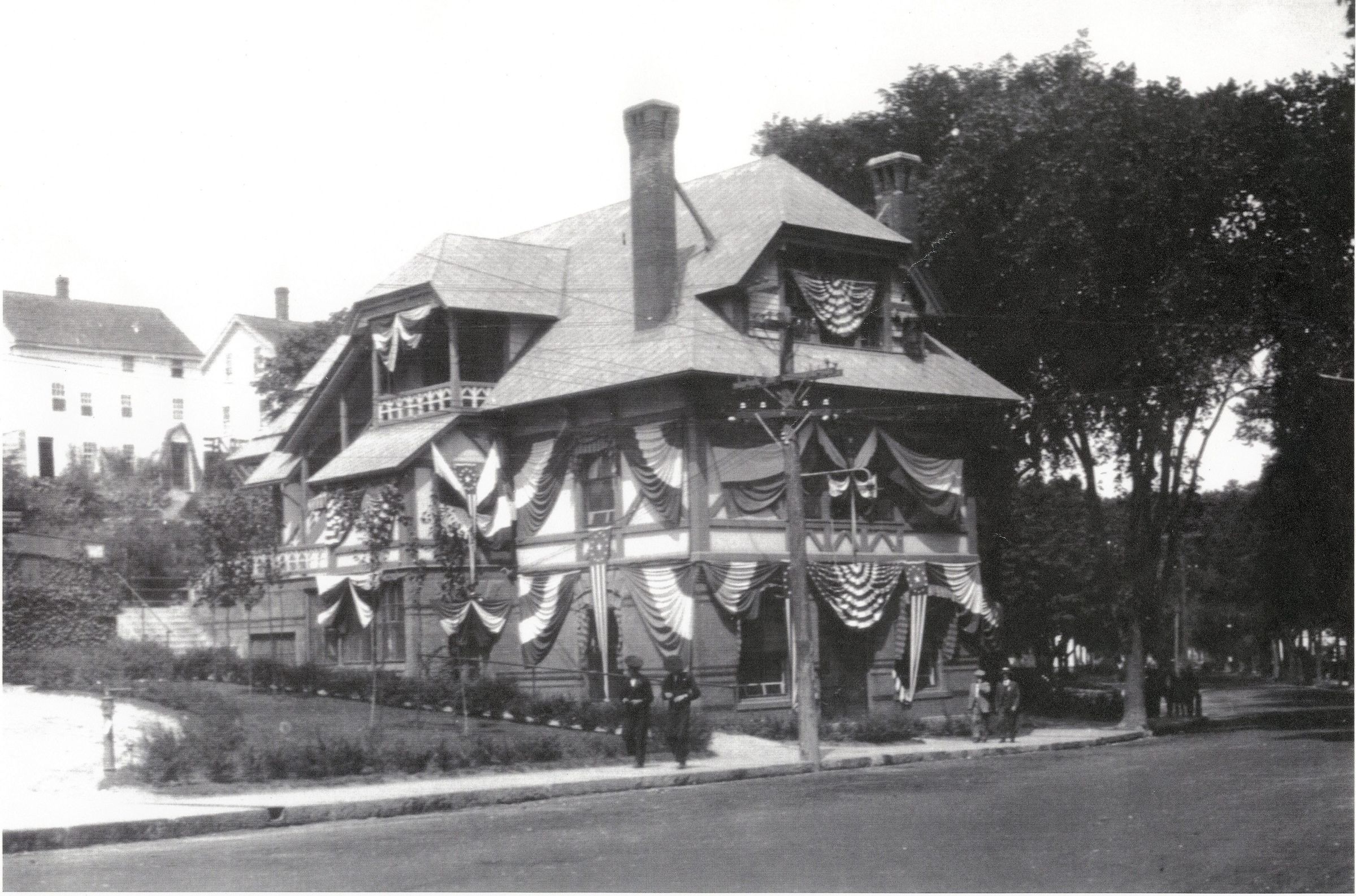 Black and white photographic print of the main office building, American Thread Company, Willimantic, CT. The building was built in 1877 by the Willimantic Linen Company as a company store (first two floors) and Dunham Hall Library (3rd floor). ATCO converted it into its main office building when it purchased the WLC in 1898. The third floor remained Dunham Hall Library until c. 1940. The building is now the Mill Museum. Unknown photographer. Taken c. 1920.Photograph Details