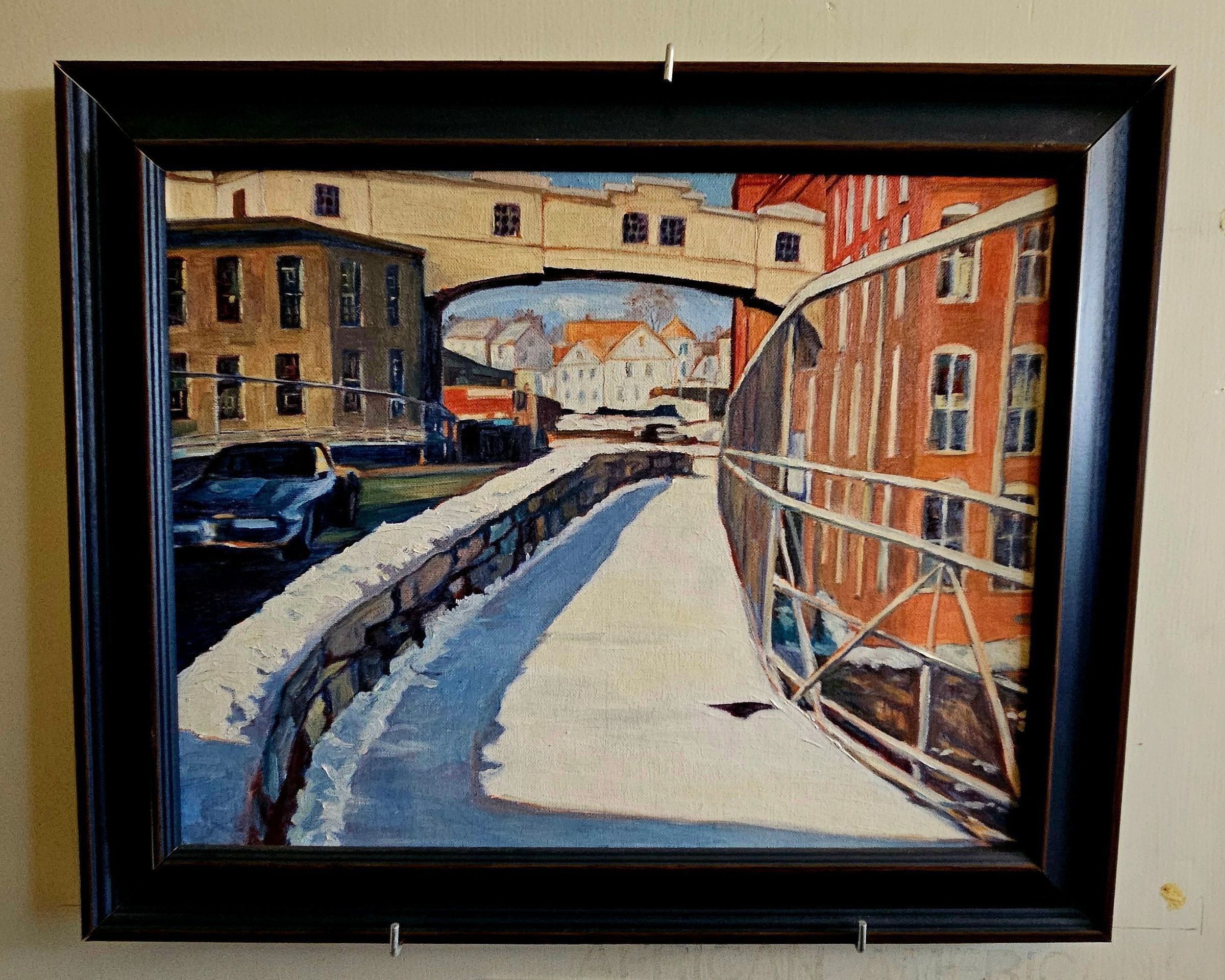 Framed oil painting by Annie Wandell of the industrial "bridge" connecting Mill No. 1 and Mill No. 5 of the American Thread Company in Willimantic, CT. The "bridge" was an enclosed walkway that linked the third floor of Mill No. 2 with the fourth floor of Mill No. 5, permitting workers to transport goods and materials between the two buildings in wheeled push carts. Also visible in the painting are Thread Mill Square and the Stone Arch Bridge below, with an automobile crossing the Stone Arch Bridge (now known as the Garden on the Bridge). The painting is a winter scene, and snow blankets the plank-surface sidewalk cantilevered off the east side of the Stone Arch Bridge in the center of scene. Built in the early 1900s, the industrial walkway bridge was a symbol of both the American Thread Company and the City of Willimantic until it was demolished in the 1990s. Based on the type of automobile shown in the painting, it appears to be set perhaps a decade before the industrial walkway and Mill No. 5 were demolished -- and was probably painted at that time, too. The factory windows are not boarded over, which likely would have occurred in the late 1908s, shortly after ATCO closed the plant. It is part of a series of paintings Wandell did chronicling the late industrial era in Willimantic.Type of Painting