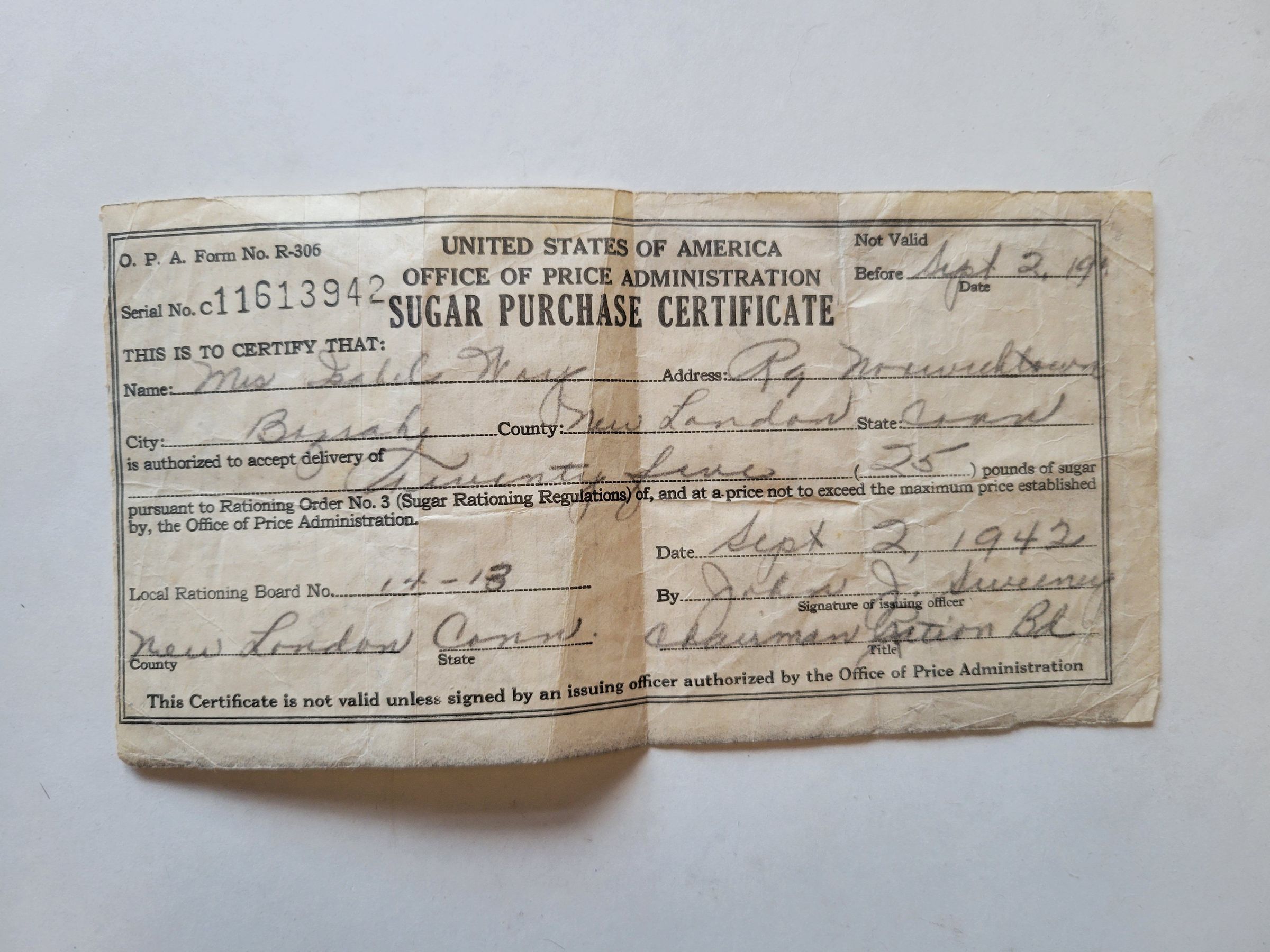 A Sugar Purchase Certificate issued to Mrs. Isabel Way, September 2, 1942. The certificate was good for 25 pounds of sugar at the price established by the Office of Price Administration. It is signed by the issuing officer September 2, 1942.Context