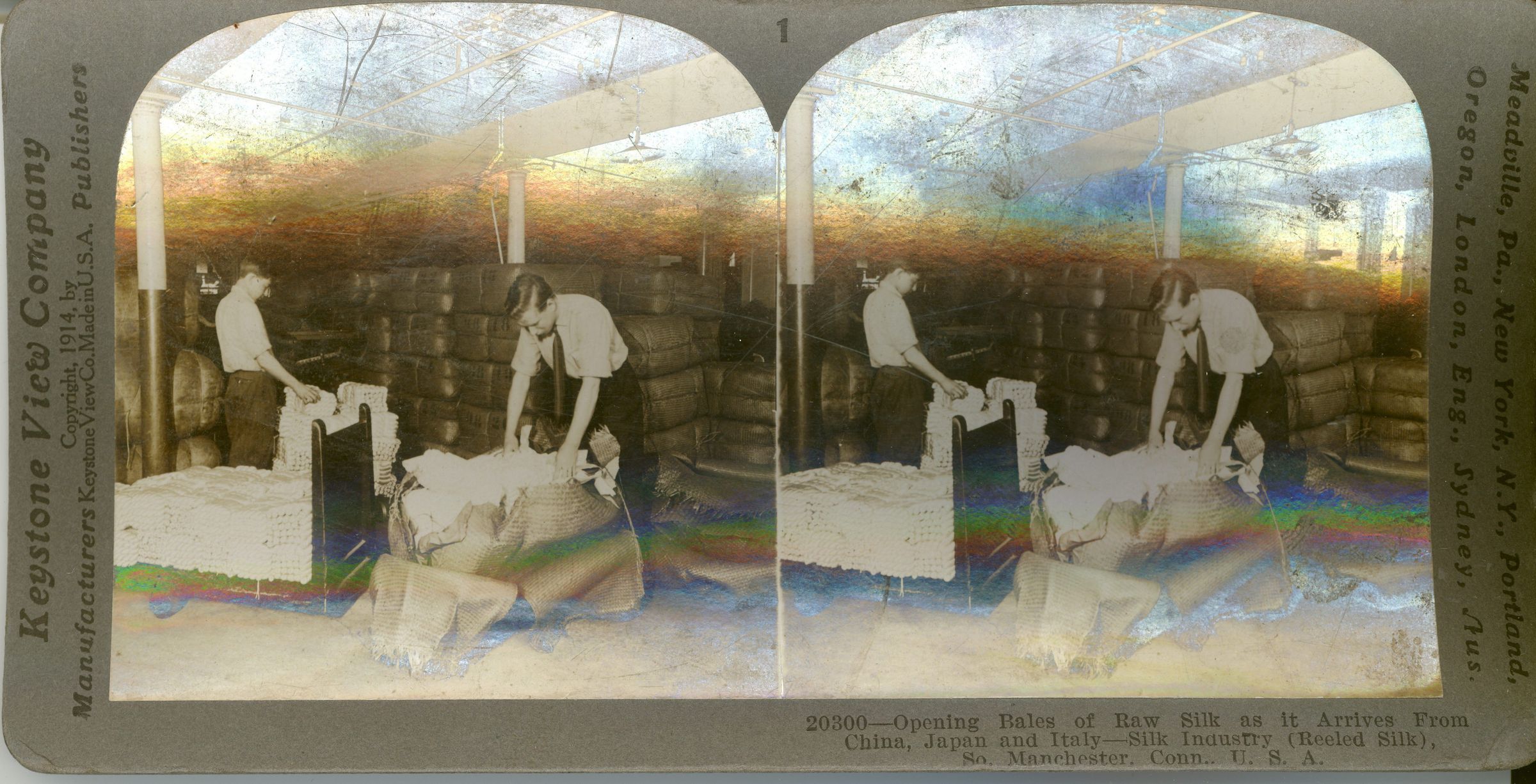 Stereograph of workers opening bales of raw silk as it arrives from China, Japan, and Italy in Cheney Brothers silk mill (reeled silk) in South Manchester, CT, USA, 1914. Black and white print on cardboard. Card is warped. Unknown photographer. Studio: Keystone View Company, Meadville, PA. Serial #20300Photograph Details