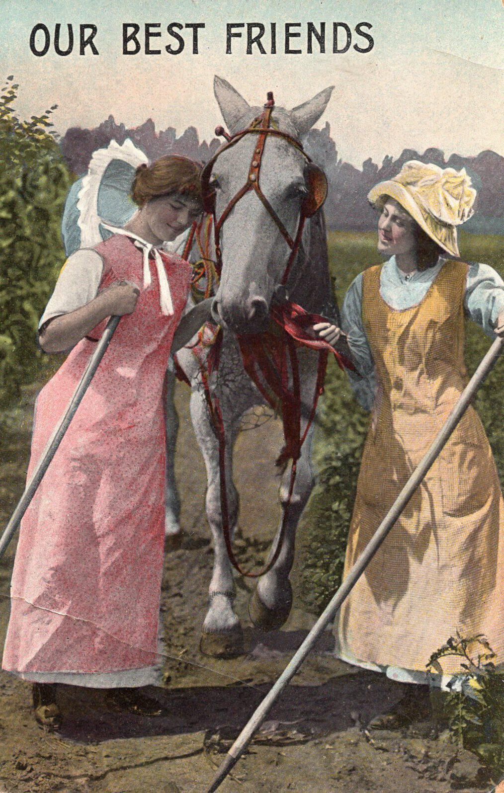 A postcard of two woman guiding a horse with the words "Our Best Friends" printed on it.Postcard Details