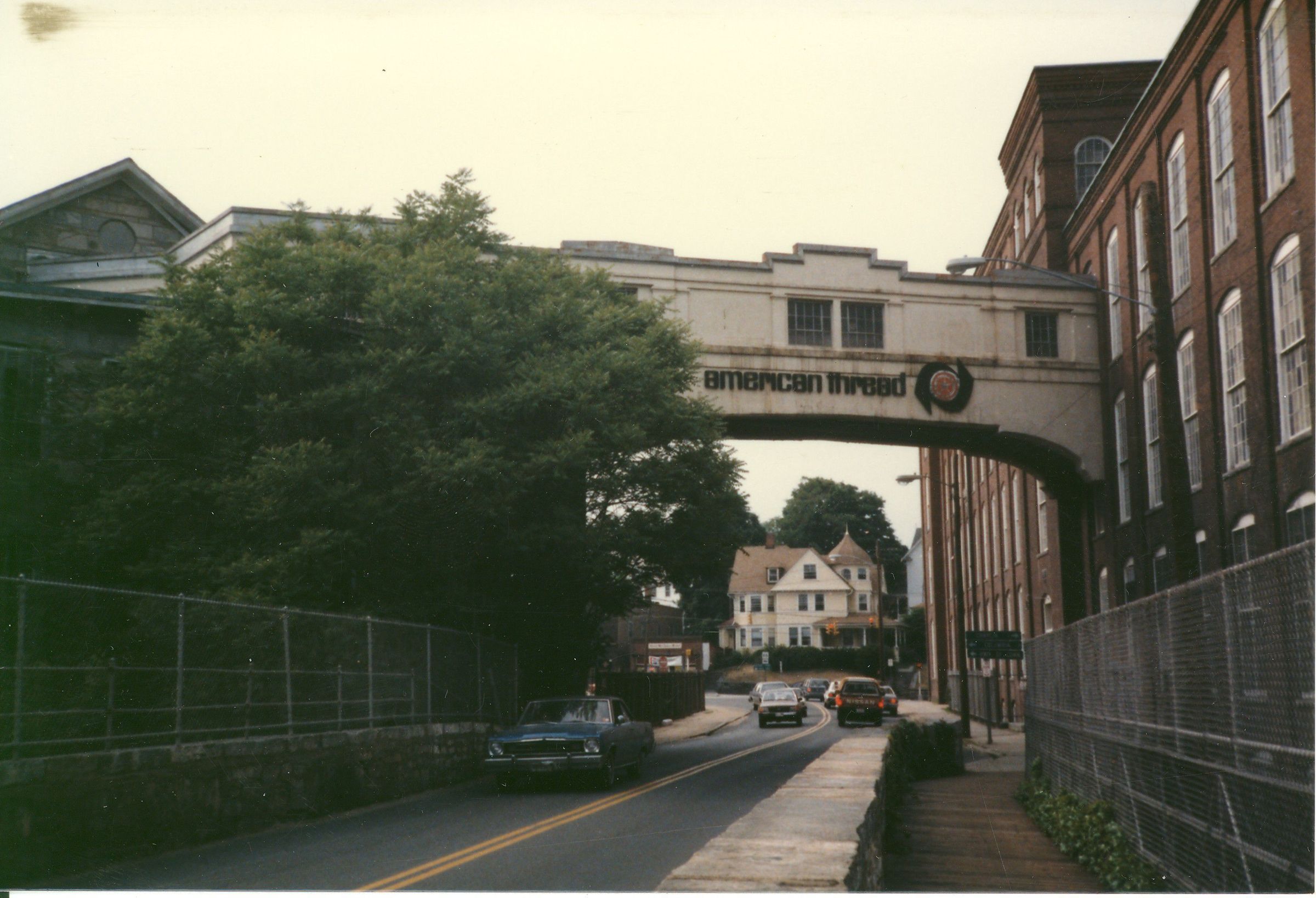 Color photographic print of the overhead "bridge" connecting Mill No. 5 to Mill No. 1, American Thread Company, Willimantic, CT. Shows stone arch bridge (now the Garden on the Bridge) below. Taken from the south end of the stone arch bridge looking north. Unknown photographer. Taken c. 1987, shortly after ATCO closed its Willimantic plant.Photograph Details