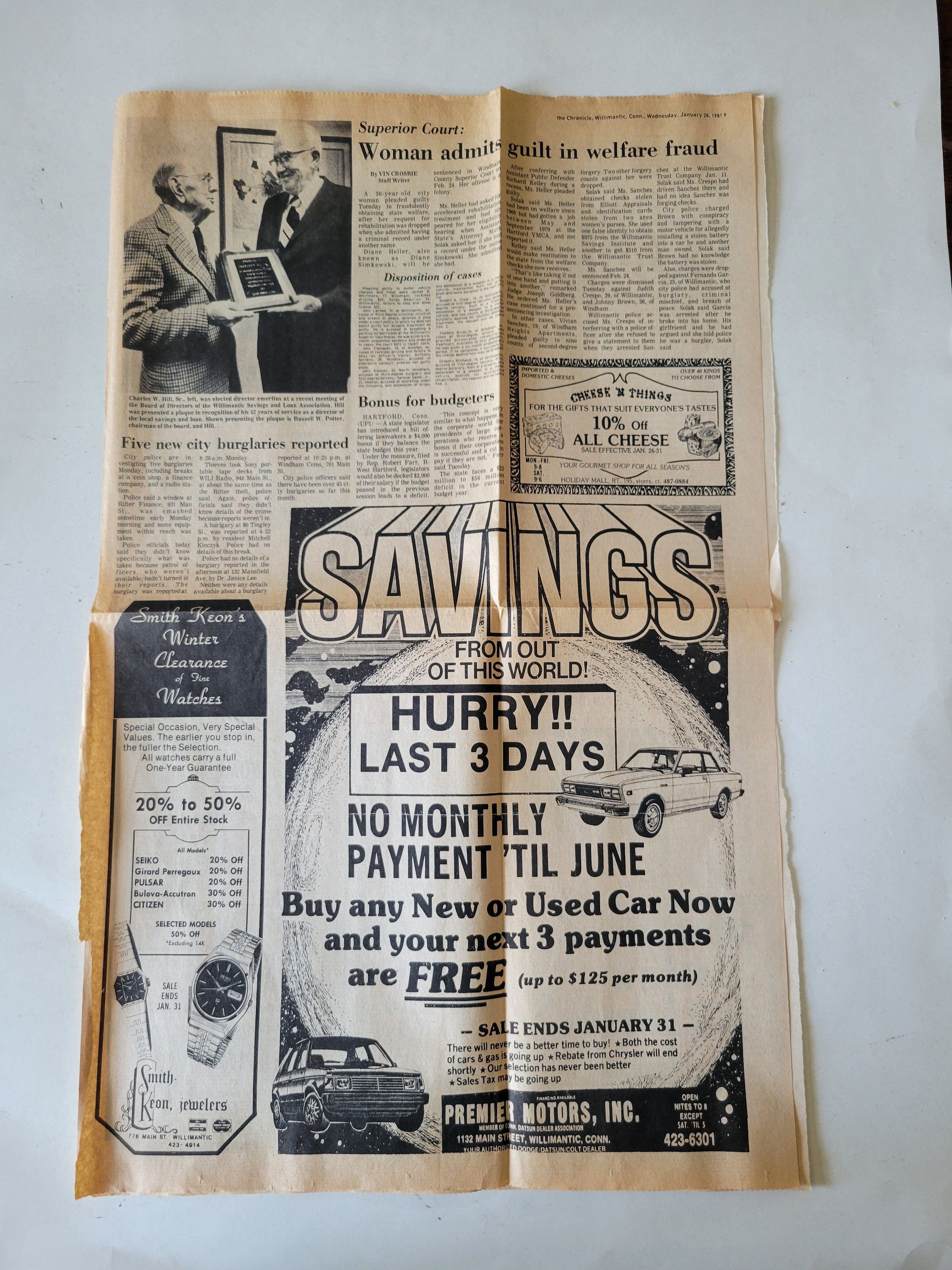 Page 9 of The Chronicle out of Willimantic, CT featuring a captioned photograph of Charles W. Hill Sr. receiving a plaque from Russell W. Potter, chairman of the Board of Directors of the Willimantic Savings and Loan Association, for Hill's 52 years of service. Newspaper published Wednesday, January 28, 1981.Collection