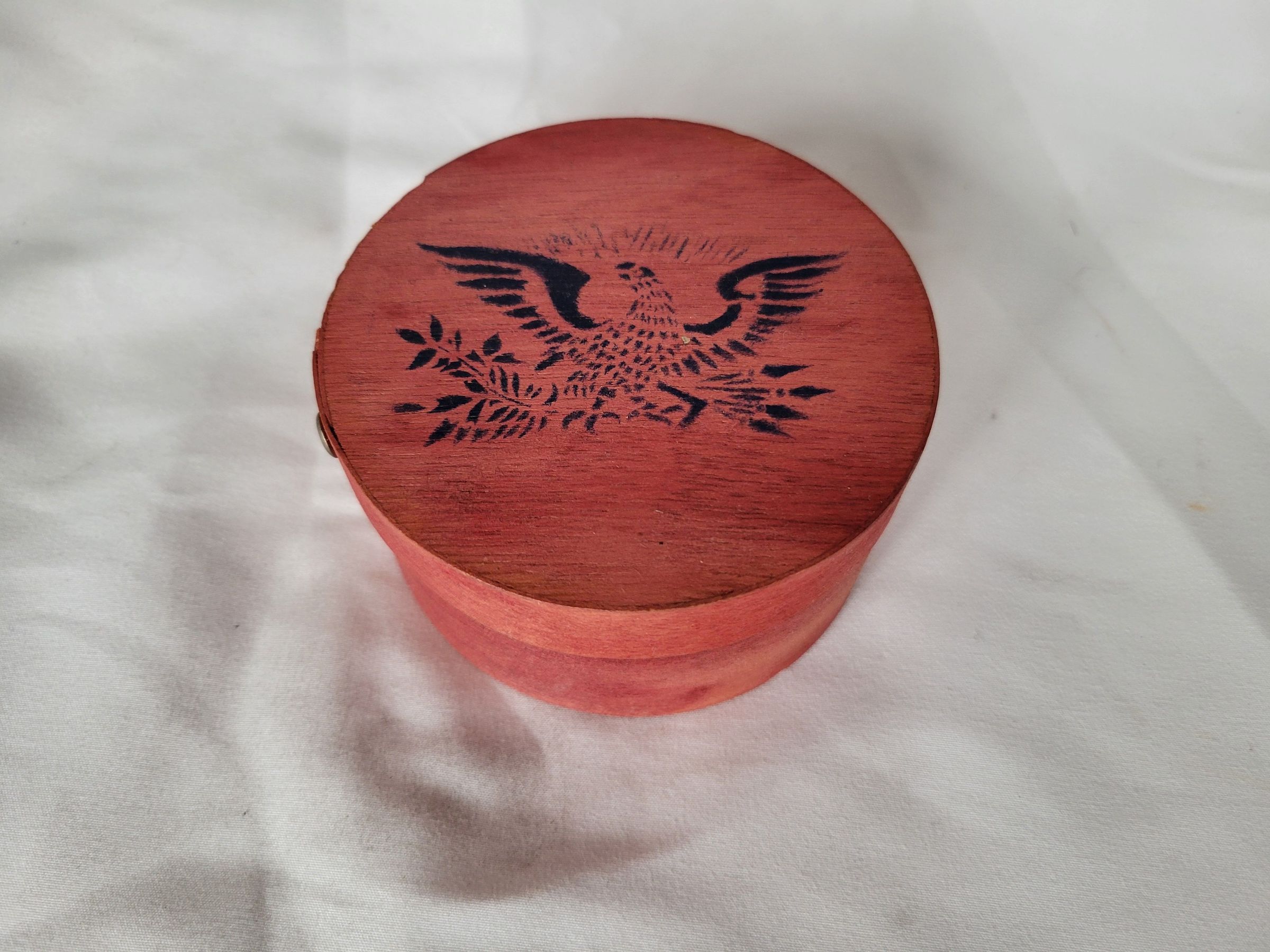 A circular basswood box, sides held together with metal rivets. It has been thinly painted a reddish-brown so that the grain of the wood shows through, with a black stencil of a bird with arrows and greenery, reminiscent of the seal of the United States.Collection