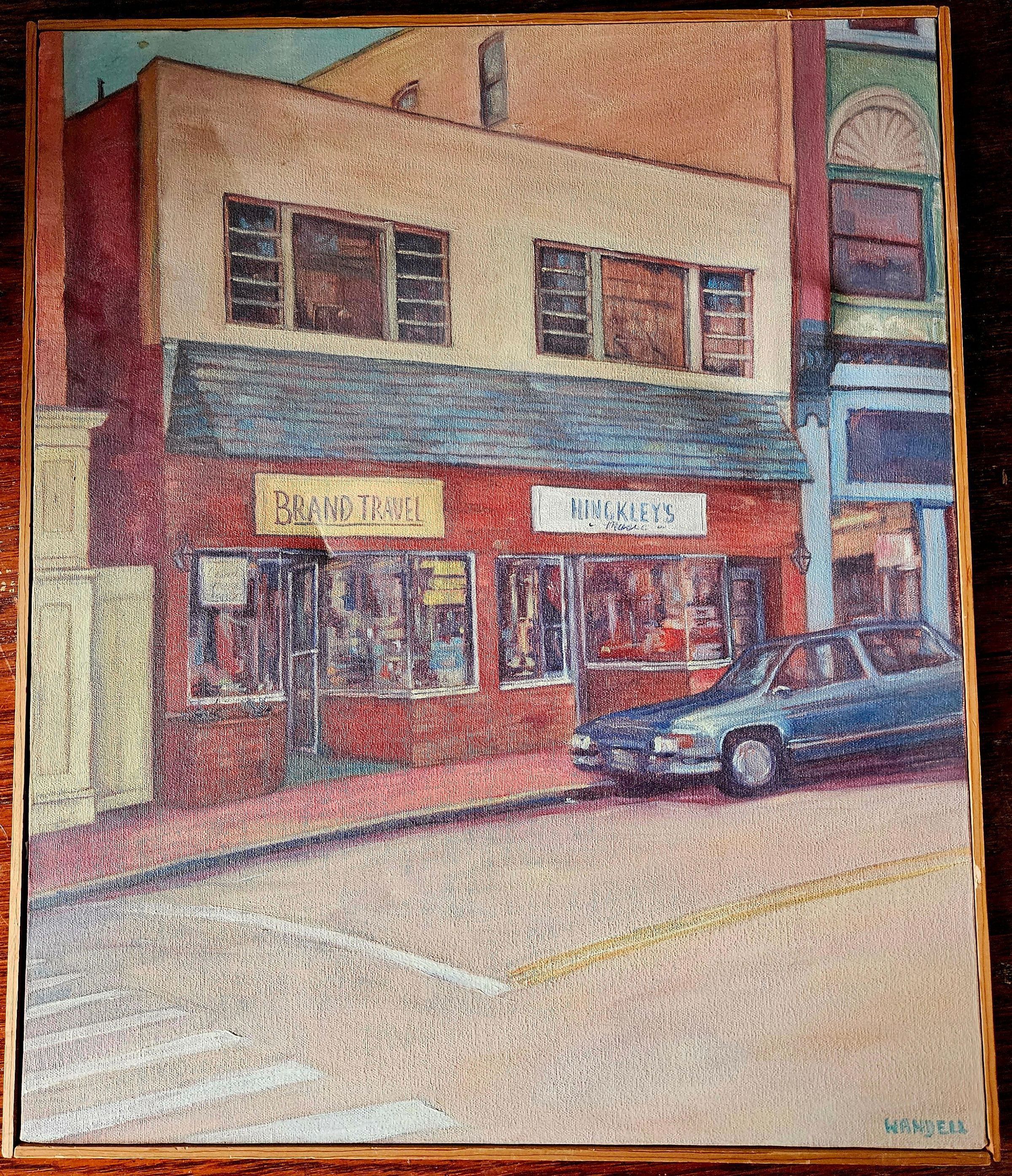 Oil painting of 733 Main Street, Willimantic, CT, by the artist Annie Wandell. The two storefronts in the painting were occupied by Brand Travel Agency and Hinckley's Music. C. 1985-95.Type of Painting