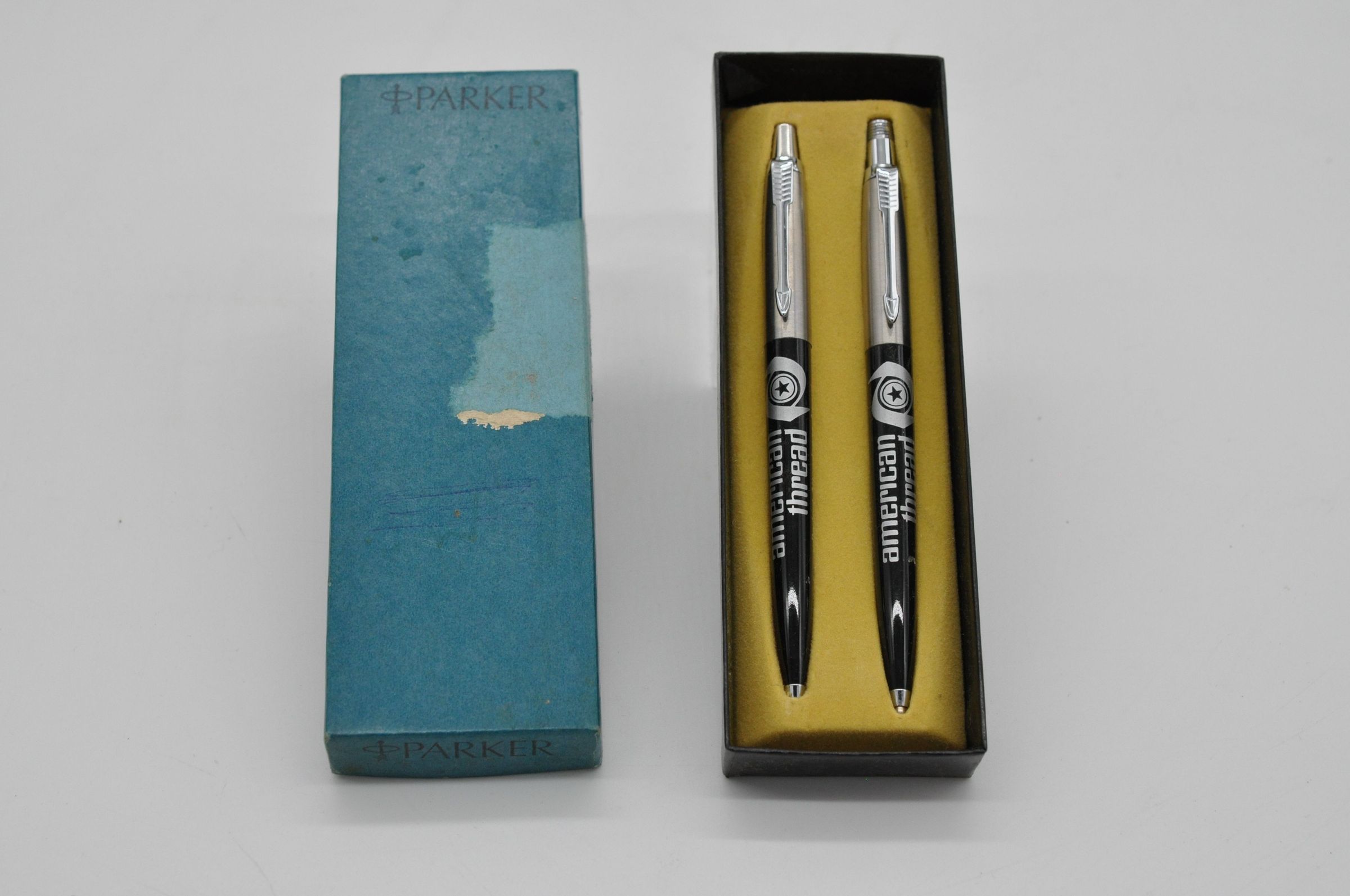 A set of American Thread Company pen and mechanical pencil made by Parker. The pen and pencil fit into the yellow custom foam form inside the cardboard box. The lid of the box is blue and the top layer of paper covering is torn off.Collection